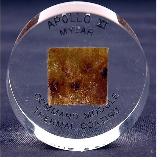 <Our item number 136912><B>Apollo 11, FLOWN, Gold Foil.</B> (1x1") enclosed in a clear lucite cylinder (2.5x1") engraved "Apollo IX / Mylar / Command Module / Thermal Coating". Pristine condition and always highly collectible. <BR>Estimated Value $250 - 350. <BR><BR>Our item number 136912<BR><IMAGES><P ALIGN="CENTER"><IMG SRC="http://www.goldbergcoins.net/liveauction/49jpegs/136912.jpg"> </P></IMAGES>