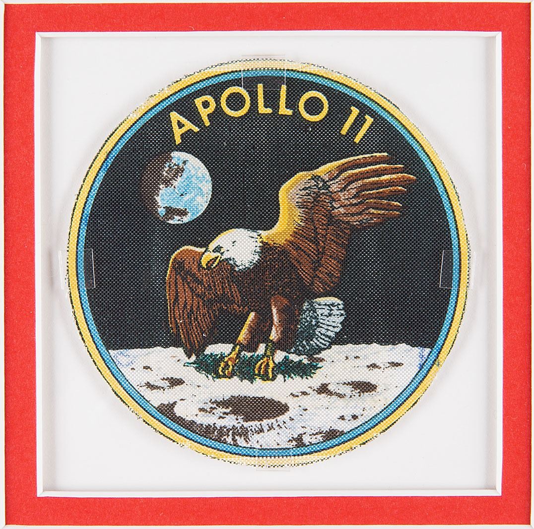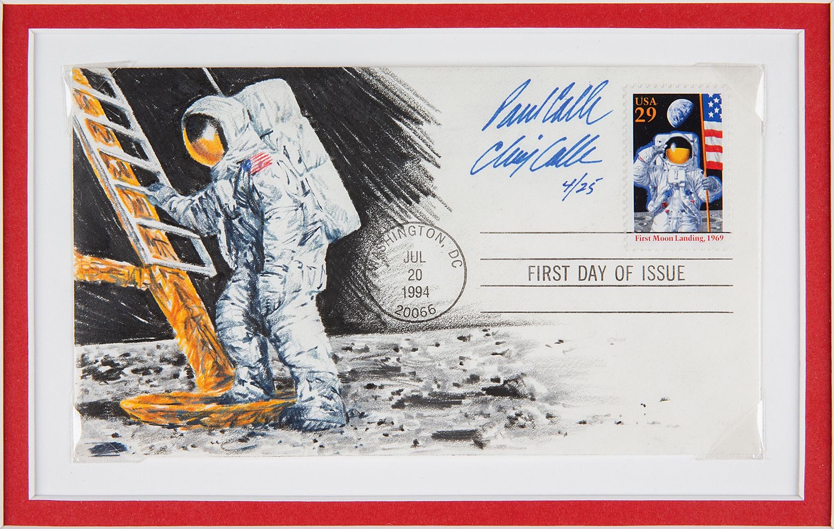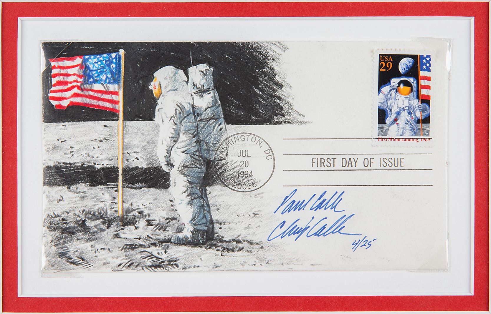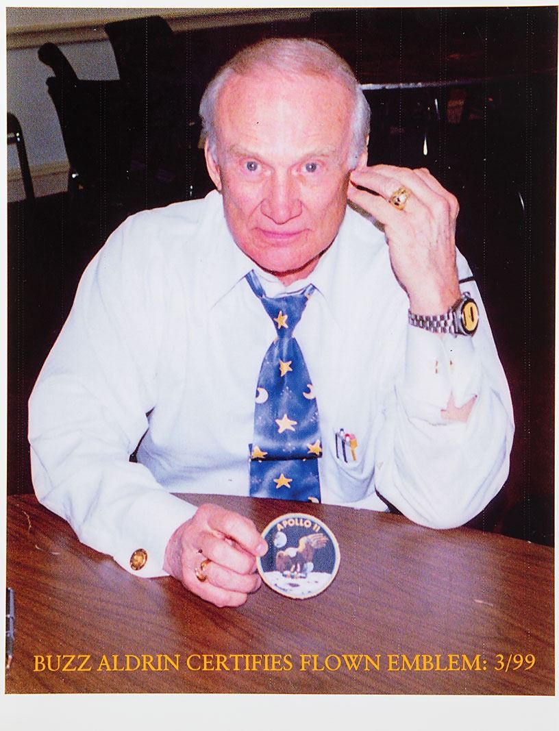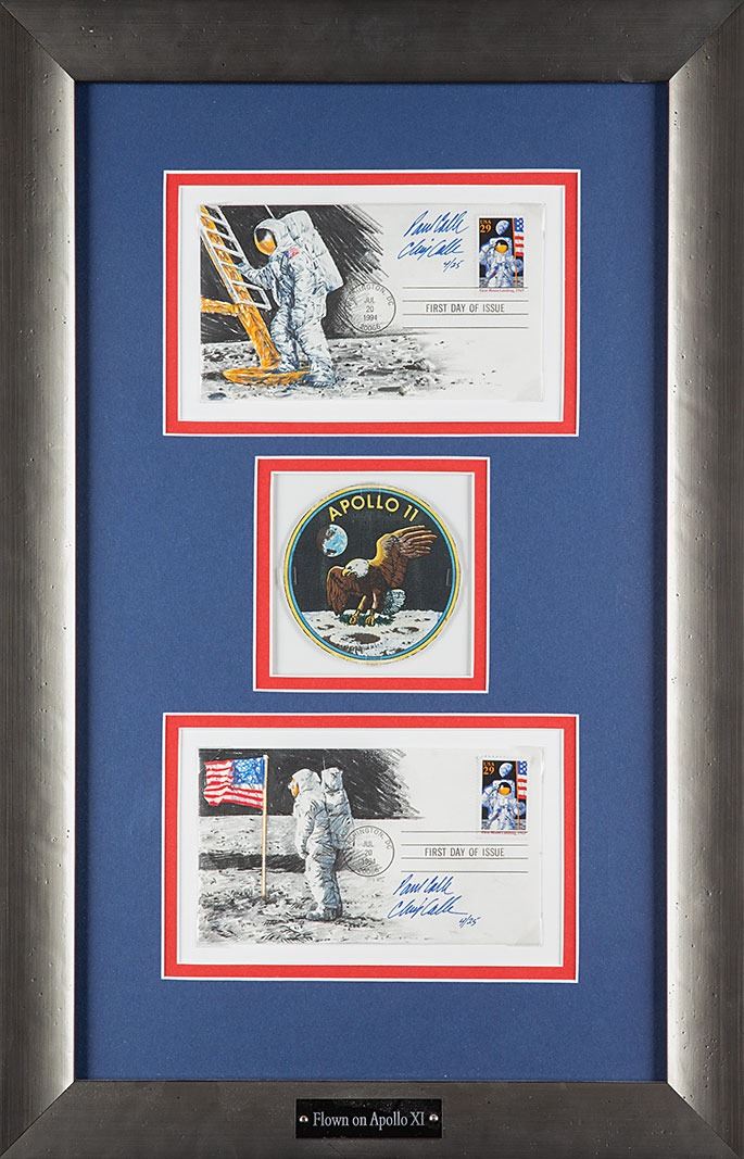 Extremely desirable flown Beta cloth patch of the Apollo 11 insignia carried to the moon during the first lunar-landing mission, measuring approximately 3.5? in diameter, signed and flight-certified on the reverse in blue felt tip, "Flown to the moon aboard Apollo XI, Buzz Aldrin." Archivally double-matted and framed with an engraved plate to an overall size of 14 x 21.75; the display also features a pair of limited edition FDCs featuring original graphite and color pencil drawings, both numbered 4/25 with silver anniversary postmarks for the Apollo 11 moon-landing, and signed in blue felt tip by father-and-son stamp design team, Paul and Chris Calle. The framed backing features a custom window for viewing the reverse of the patch. In fine condition. Accompanied by a photo of Aldrin posing with the patch, indicating that it was flight-certified in March 1999.