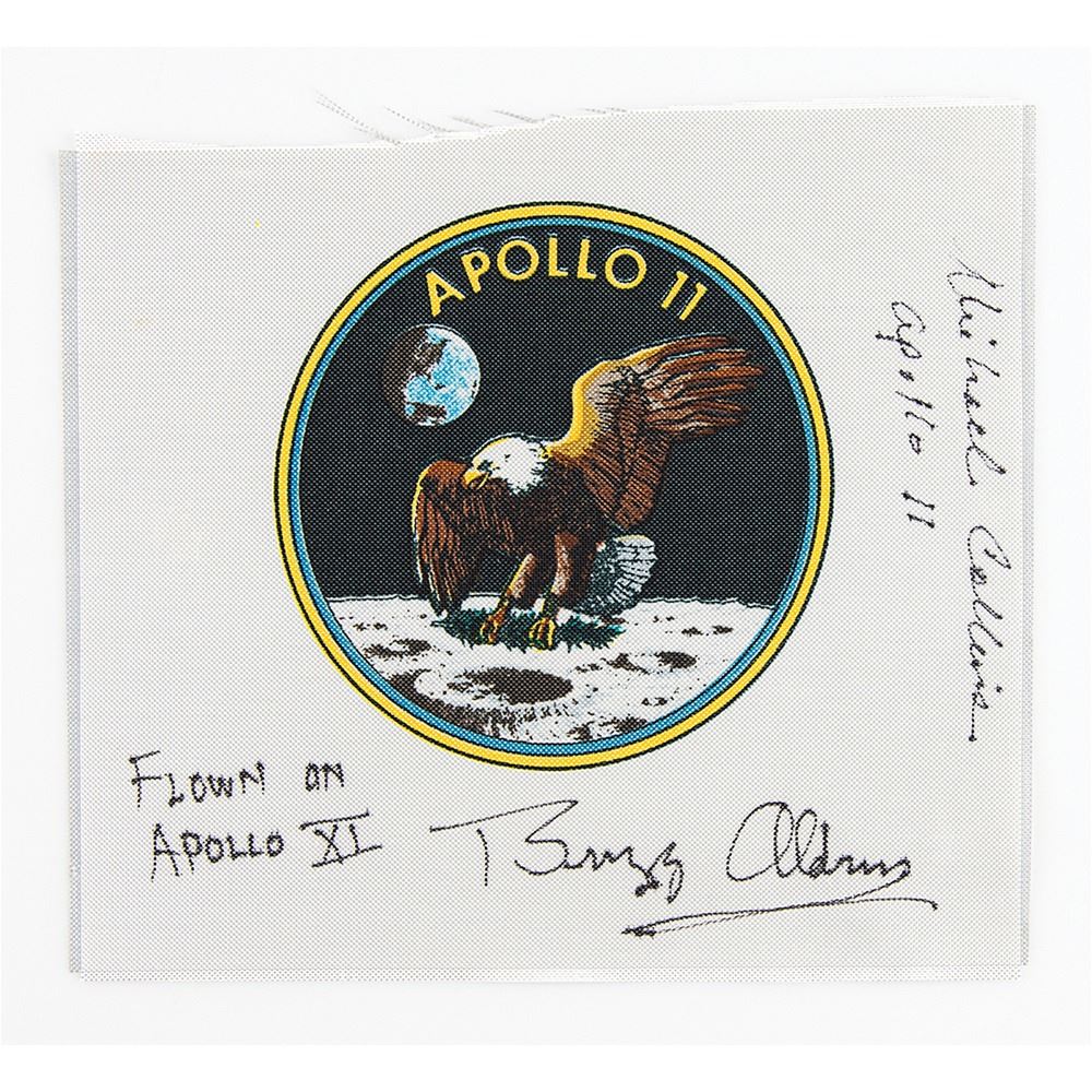 Exceptional flown 5.75 x 5.25 swatch of Beta cloth featuring the Apollo 11 insignia that was carried to the moon during the first lunar-landing mission, signed and flight-certified in black felt tip, "Flown on Apollo XI, Buzz Aldrin‰Û and ‰ÛÏMichael Collins, Apollo 11.‰Û In fine condition. A superb flown format signed by the storied LMP and CMP of the first lunar landing mission.