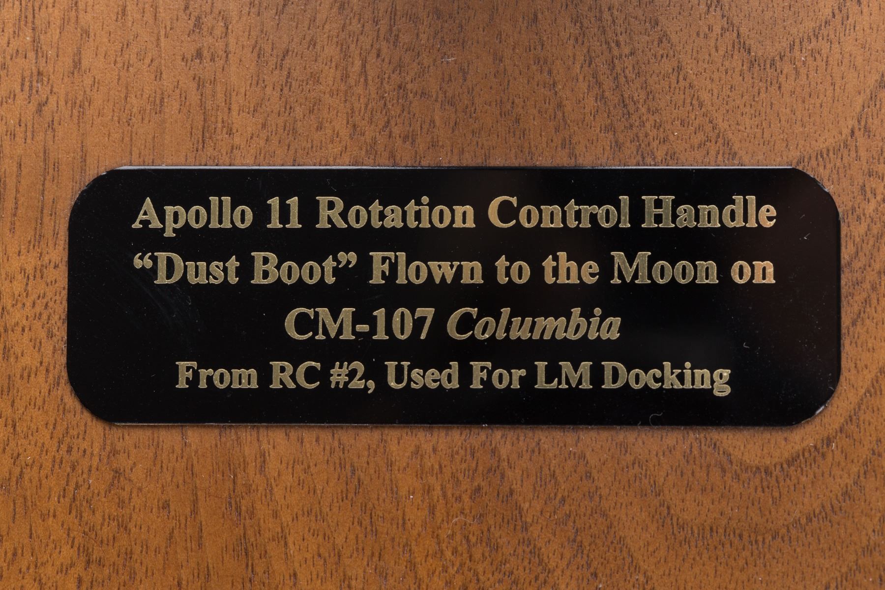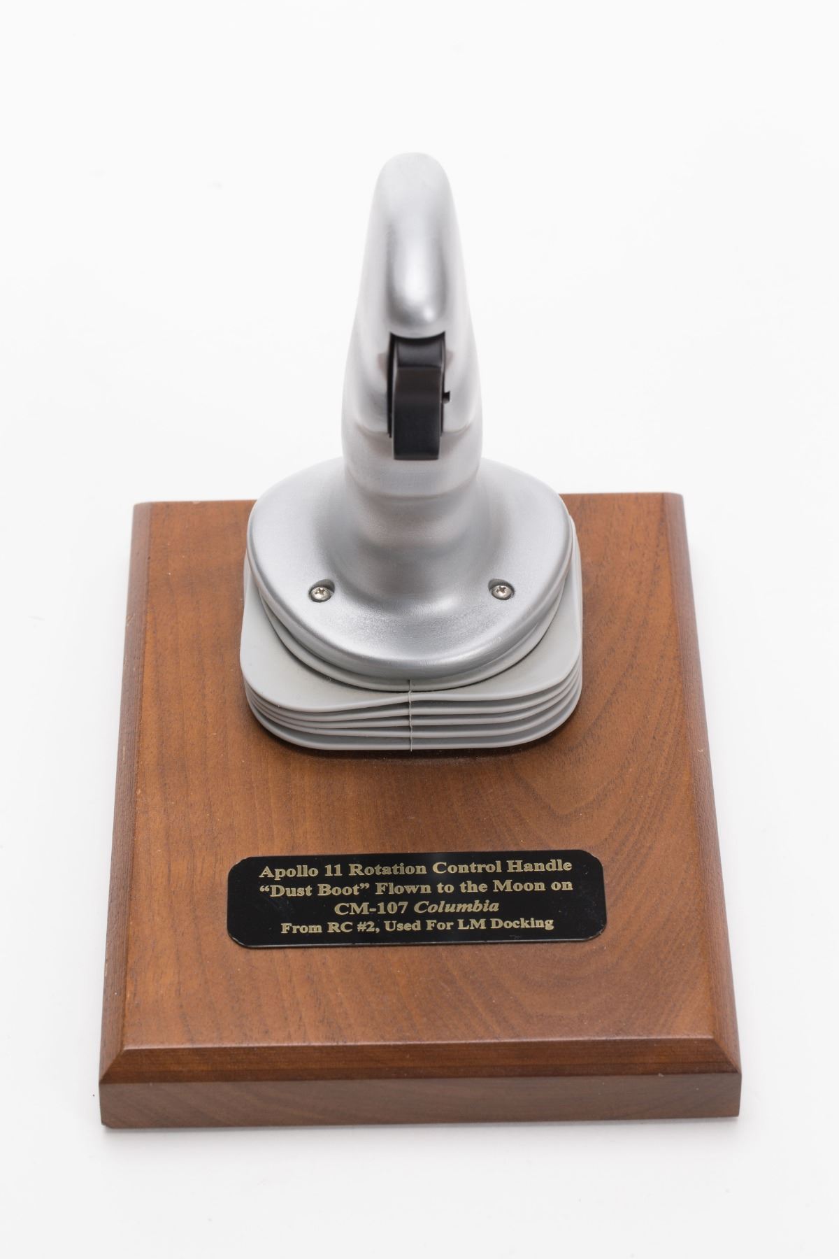 Flown Apollo 11 Command Module Rotation Hand Controller Dust Boot removed from the base of Rotation Controller #2, located between the middle and left seats. This controller was used for docking the Command Module to the Lunar Module. The gray rubber dust boot has five accordion-like segments, and is displayed on a plaque with a replica of the 'joystick-type' hand controller grip. The wooden plaque features an engraved plate, reading: "Apollo 11 Rotation Control Handle 'Dust Boot' Flown to the Moon on CM-107 Columbia, From RC #2, Used for LM Docking." In fine condition. Accompanied by a letter of provenance. A unique flown piece that was utilized in the critical LM/CM docking sequence during man's first lunar landing mission.