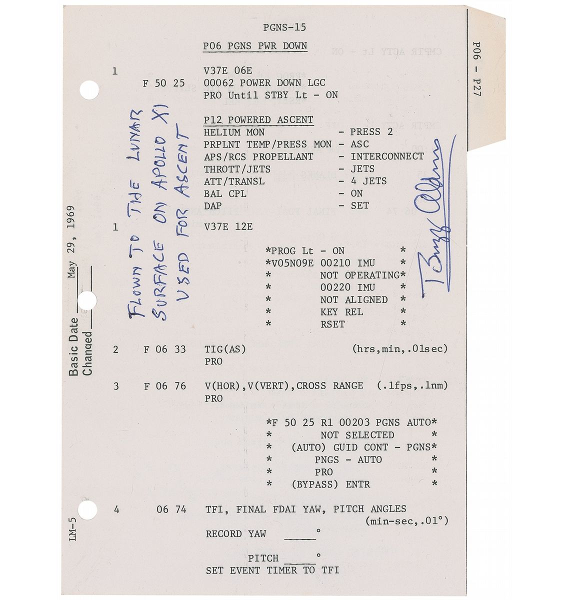 Accompanied by a very detailed two-page letter of provenance and explanation signed by Aldrin, which reads, in part: “Enclosed with this letter are two sheets numbered PGNS-15/16 and PGNS-17/18 from the Apollo 11 LM G and N Dictionary, Part No. SKB32100074-361, S/N 1001. It is part of the entire checklist that was carried to the lunar surface in the Lunar Module Eagle on the first lunar landing…These sheets are from the Primary Guidance and Navigation Section (PGNS) and have computer procedures to perform the lunar lift-off to enable Neil Armstrong and I to leave the Moon. These are some of the most significant pages from the entire dictionary. Page PGNS-15 has the P06 or PGNS Power Down Program steps to put the flight computer into a standby mode. The most important steps are the ones listed under P12 Powered Ascent. This was the program to enable lift-off from the moon. Neil Armstrong and I were ready to implement these steps immediately after our lunar landing on July 20 if an emergency arose. We also had this page available during predetermined abort periods throughout the lunar stay if an early lift-off was needed…The steps from page PGNS-15 were used to properly set up our computer for the P 12 Powered Ascent Program. The steps on PGNS-16 are exactly the same as the last minute of the countdown from our Lunar Surface Checklist. While that checklist ended at ‘Eng Start—Push’ to start lift-off, page PGNS-16 has all the expected events and steps during our actual flight profile from the lunar surface. This page as well as PGNS-17 was a reassuring guide to have as we made our way to lunar orbit. The next phase was the complicated rendezvous sequence listed on page PGNS-18 which was the start of the P 20 Rendz Nav or rendezvous navigation. Almost 4 hours after lunar lift-off, we finally joined up and docked with Mike Collins in Columbia. Along the side of page PGNS-15 I have written: ‘Flown to the lunar surface on Apollo XI. Used for Ascent.’ I have signed that page plus signed page PGNS-16. On page PGNS-17 I have written: ‘Flown to the lunar surface on Apollo XI. Used for Ascent.’ I have signed that page and signed page PGNS-18.”