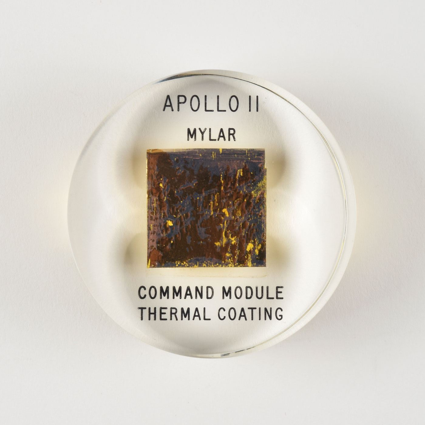 Large flown 1 x 1 swatch of Mylar thermal coating recovered from the Apollo 11 command module. Encased in a circular Lucite display with imprinted text: “Apollo 11 Mylar Command Module Thermal Coating.” In fine condition.