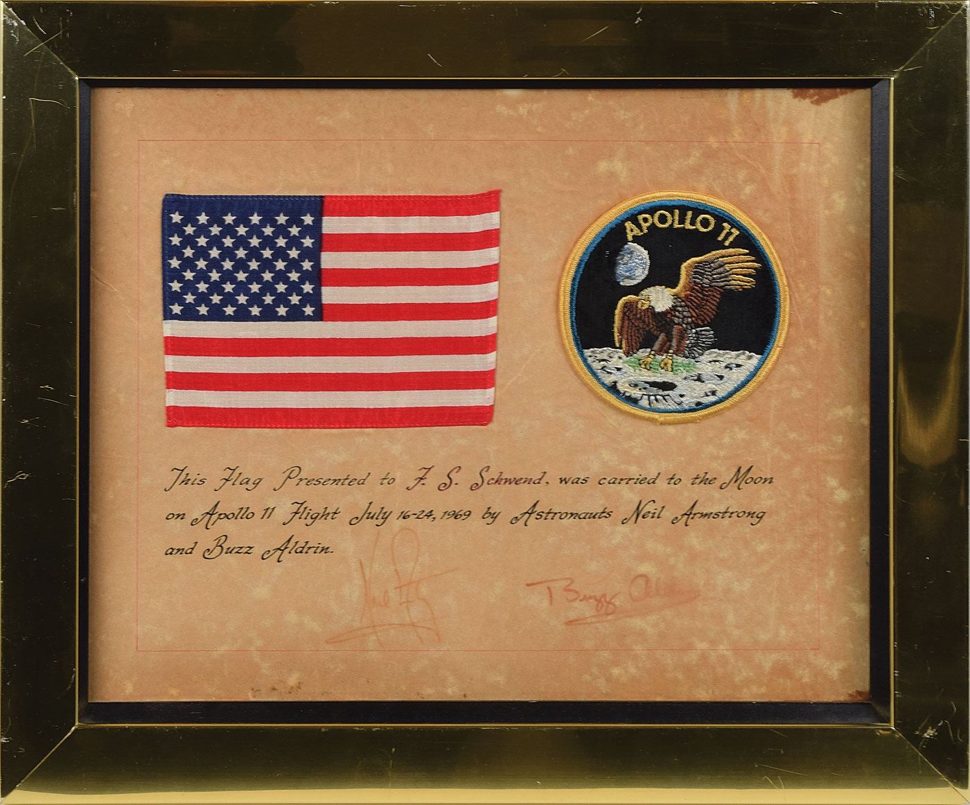 Extremely desirable flown American flag carried on the Apollo 11 mission, 5.75 x 4, affixed to its original 13.5 x 10.5 presentation certificate, bearing calligraphic text: "This Flag Presented to F. S. Schwend, was carried to the Moon on Apollo 11 Flight July 16–24, 1969 by Astronauts Neil Armstrong and Buzz Aldrin." Signed below in black felt tip by Armstrong and Aldrin. A rare Texas Art Embroidery 4? mission patch has also been applied to the certificate, which has been reframed to an overall size of 16.75 x 14. Includes a matte-finish 10 x 8 photo of Aldrin presenting this certificate to Schwend shortly after his return from the mission, signed and inscribed in felt tip, "To Fred Schwend, With appreciation for your efforts to promote Americanism, Buzz Aldrin, Apollo 11." In very good condition, with mottled overall toning and dampstaining, which has rendered the signatures light but legible, and somewhat blurred Aldrin's surname. As the certificate makes no mention of CMP Michael Collins's involvement in the historic mission, it seems probable that this was a surface-flown flag carried inside the Lunar Module Eagle, rather than one simply carried into lunar orbit aboard the Command Module. Flown American flags are among the most sought-after space collectibles, and this example in particular is enhanced by its direct photographic provenance.