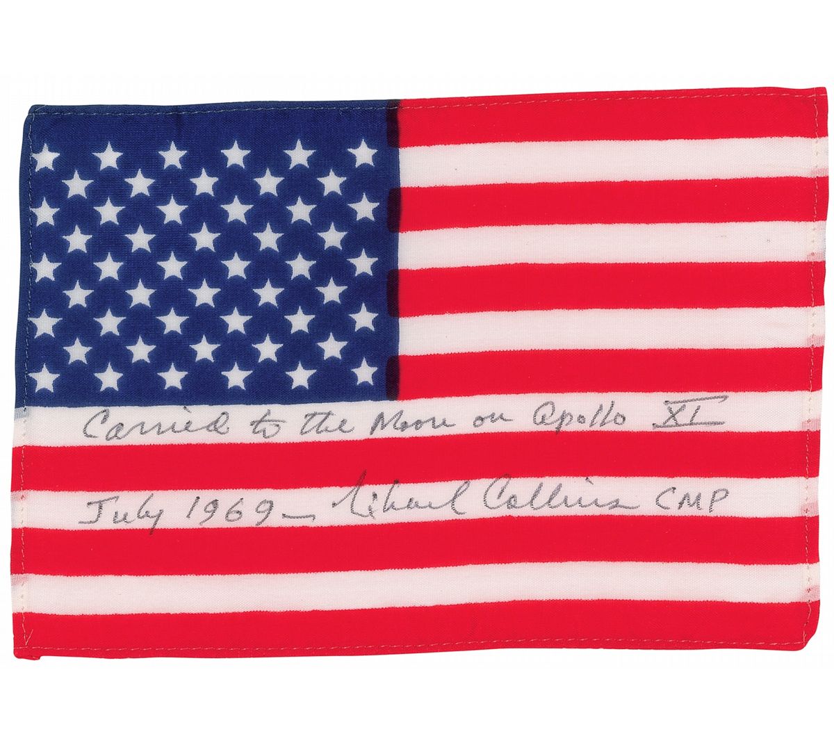 Extremely rare and exceptionally desirable flown American flag carried on board Apollo 11, 6 x 4, signed and flight-certified in black felt tip by Command Module Pilot Michael Collins, “Carried to the moon on Apollo XI, July 1969—Michael Collins CMP.” Includes an ALS signed "Michael Collins, Apollo XI CMP," dated July 2014, in full: "I hereby certify that the accompanying 4? x 6? U.S. flag was flown by me aboard Apollo XI to the moon in July 1969, and had been in my personal possession ever since." Also accompanied by a color 10.25 x 12.75 presentation certificate signed in black felt tip by Collins. Certificate reads, “This flag traveled to the moon with Apollo 11, the first manned lunar landing, July 20, 1969 / Apollo 11 / July 16-24, 1969 / Armstrong, Collins, Aldrin” and bears the mission’s eagle emblem below. Neil Armstrong’s famous words are also printed along the bottom border, “One small step for a man, one giant leap for mankind.” In fine condition. An iconic and highly coveted relic flown to the moon on the most historic and avidly collected of all Apollo missions.