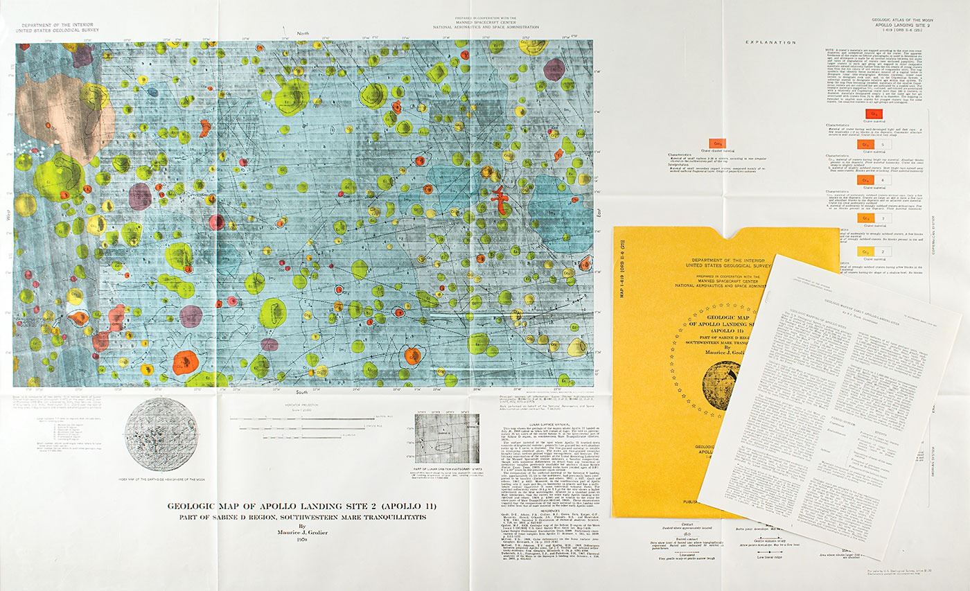 Desirable Apollo 11 geological map of the Sabine D region, southwestern Mare Tranquillitatis of the moon by Maurice J. Grolier, published by the US Geological Survey in 1970. The 1:25,000 scale map, 41˝ x 24˝, entitled “Geologic Map of Apollo Landing Site 2 (Apollo 11),” shows the lunar surface east of Tranquility Base with multicolored circles indicating various mare and crater material. A section marked “Lunar Surface Material,” in part: “This map shows the geology of the region where Apollo 11 landed on July 20, 1969 (arrow in lower left corner of map). The site is approximately 20 km south of the crater Sabine D, in the west-central part of the Sabine D region, in southwestern Mare Tranquillitatis.” Includes the original Department of the Interior, United States Geological Survey (Map I-619) storage folder and the stapled 4-page information packet. In fine, folded condition, with a tiny tear to bottom edge of folder. The Sabine D crater was later renamed the Collins crater in honor of Apollo 11 Command Module Pilot Michael Collins. Located about 25 kilometers to the north of the Apollo 11 landing site, Collins is a tiny lunar impact crater located on the southern part of the Mare Tranquillitatis, the Sea of Tranquility.