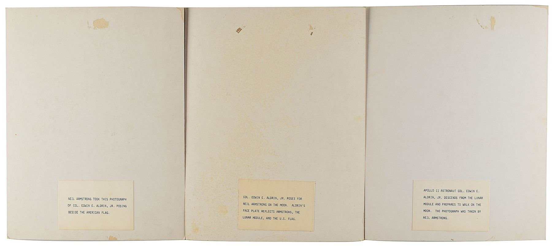 Three original vintage color semi-glossy 9 x 11.5 photographs taken during the Apollo 11 mission, including shots of Buzz Aldrin descending the LM's ladder, Aldrin standing next to the American flag, and the famous 'visor' shot of Aldrin in which Neil Armstrong's reflection is seen. Each is affixed to a same-size mount and captioned on the reverse: "Apollo 11 Astronaut Col. Edwin E. Aldrin, Jr. descends from the Lunar Module and prepares to walk on the moon. The photograph was taken by Neil Armstrong," "Neil Armstrong took this photograph of Col. Edwin E. Aldrin, Jr. posing beside the American flag," and "Col. Edwin E. Aldrin, Jr. poses for Neil Armstrong on the moon. Aldrin's face plate reflects Armstrong, the Lunar Module, and the U.S. flag." In overall fine condition, with some subtle spotting to photo finishes, and slight foxing to the mounts on the reverse.