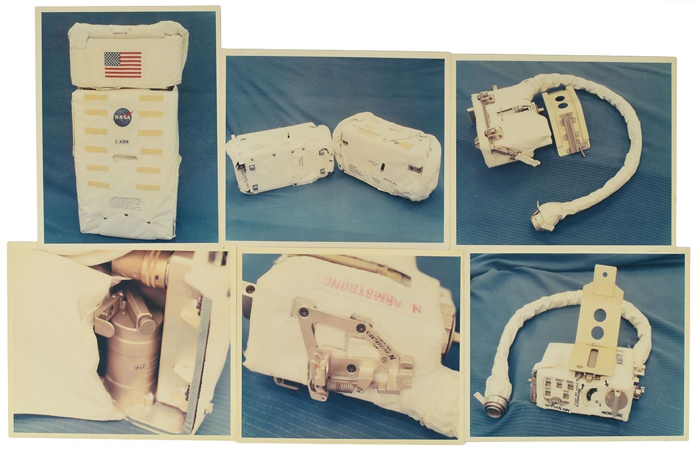 Six official color glossy NASA photos, 8 x 10 and 10 x 8, each depicting an integral piece of lunar equipment used by a crew-member of Apollo 11, with images including: LMP Buzz Aldrin's Oxygen Purge System (OPS) and Portable Life Support System (PLSS); a gas separator without guard for a PLSS; an OPS latching bracket; the OPSs for CDR Neil Armstrong and LMP Aldrin; a Remote Control Unit (RCU) with camera bracket; and an RCU positive lock device and camera mount bracket. Reverse of each photo bears purple NASA caption text and "A Kodak Paper" watermarks. In overall fine condition.