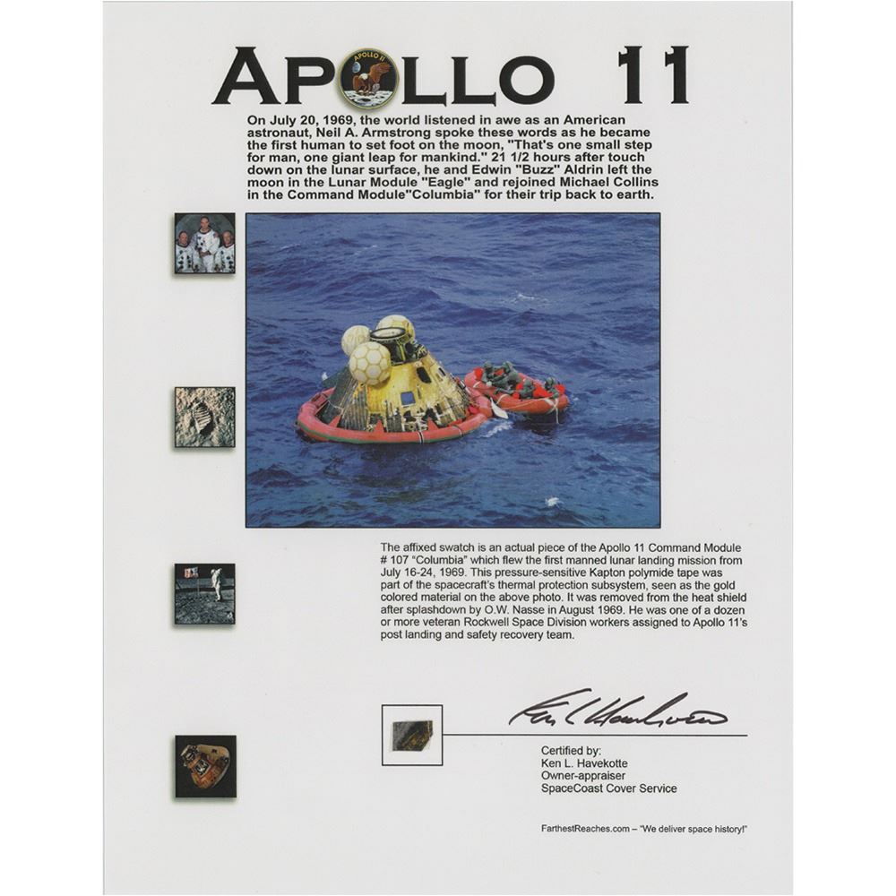 A .5 x .25 swatch of Kapton foil attested to as flown by Ken Havekotte, from the Apollo 11 Command Module Columbia's thermal protection subsystem. Affixed to an 8.5 x 11 informational presentation sheet hand-signed by Havekotte, stating that it was removed after splashdown by O. W. Nasse, who was assigned to the Apollo 11 post landing and safety recovery team. In fine condition.