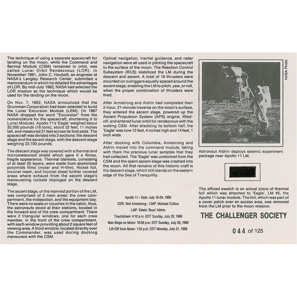 Unflown limited edition swatch of Kapton foil, measuring .75 x .25, removed from the Apollo 11 Lunar Module Eagle prior to its lunar-landing mission. The swatch is affixed to a printed 8.5 x 5.5 information sheet as prepared by The Challenger Society, numbered 44/125, which reads, in part: "The affixed swatch is an actual piece of thermal foil which was attached to 'Eagle,' LM #5, the Apollo 11 lunar module. The foil, which was part of a cover patch over an access area, was removed from the LM prior to the moon mission." In fine condition.