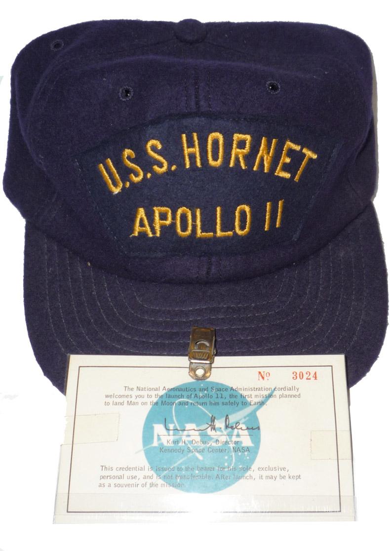 Original baseball cap and pass from historic Apollo 11 space launch. Navy blue with stitching reads ''U.S.S. Hornet / Apollo 11.'' Comes with a NASA John F. Kennedy Space Center launch pass, stamped no. 3024. Front emblems include eagle landing on moon with Earth in background and vintage NASA logo. Text on back reads in part ''…welcomes you to the launch of Apollo 11, the first mission…to land Man on the Moon…'' Pass measures 5'' x 3'' in original plastic holder. Tape to left and right of holder. Near mint condition.
