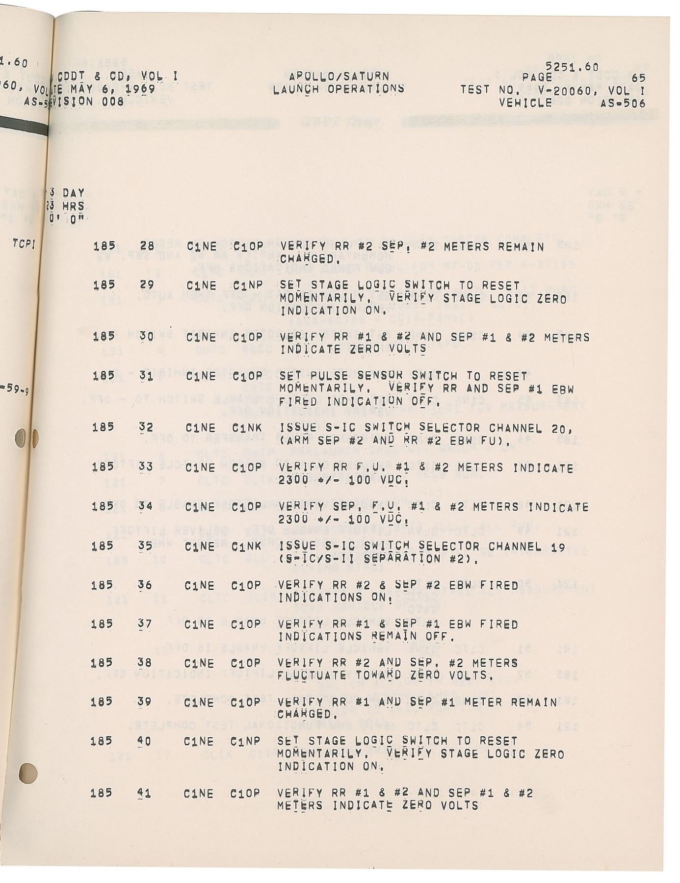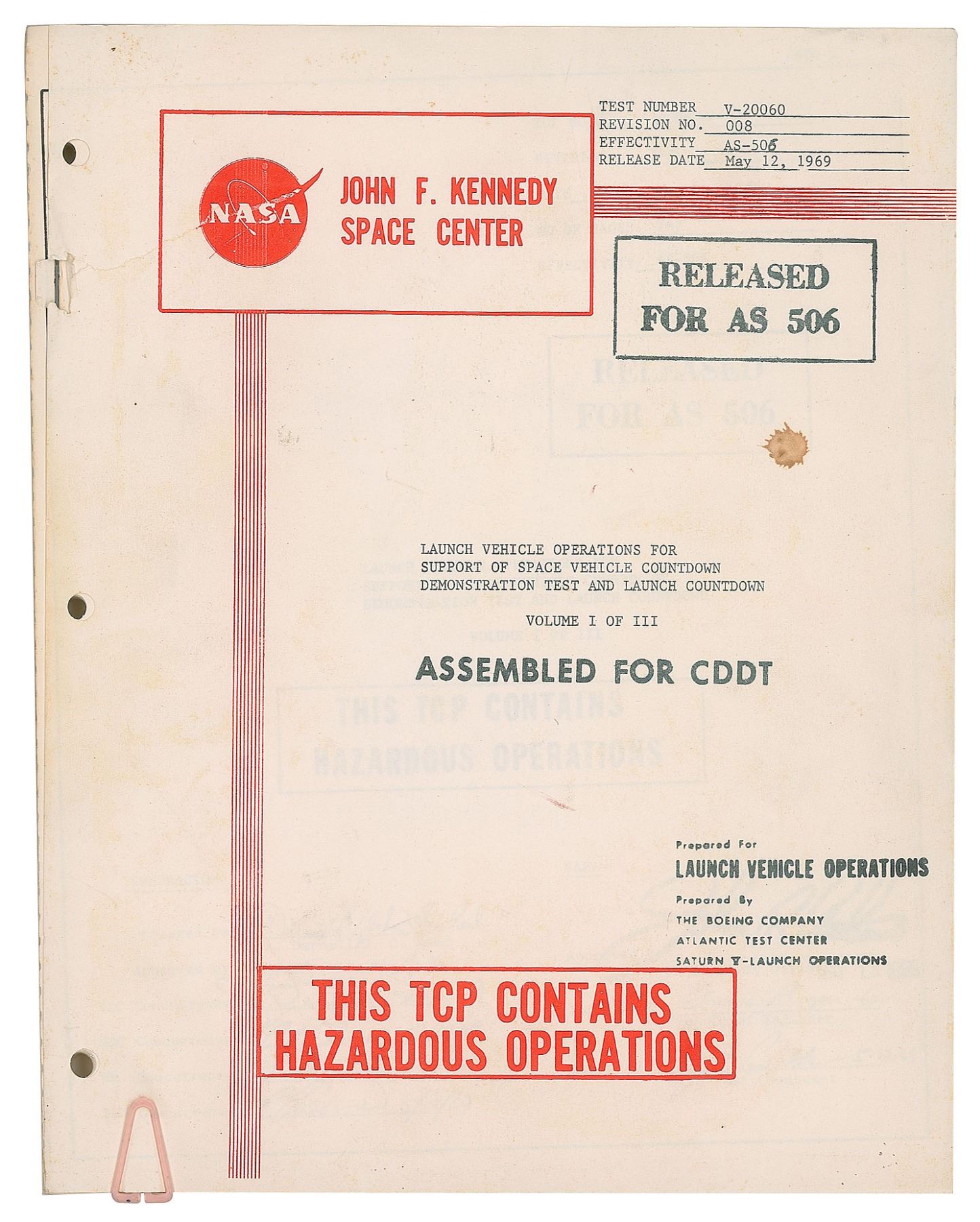 Two staple-bound 8.5 x 11 NASA manuals entitled "Launch Vehicle Operations for Support of Space Vehicle Countdown Demonstration Test and Launch Countdown," Volumes 1 and 2 (of a 3-volume set), "Assembled for CDDT," prepared by the Boeing Company, Atlantic Test Center, Saturn V–Launch Operations, with volumes bearing matching test number, "V-20060," revision number, "008," and effectivity, "AS-506." The first 207-page volume is dated May 12, 1969, with operating steps covering launch vehicle operations through spacecraft cryogenic loading; the second volume, 408 pages with appendices, is dated May 26, 1969, features operating steps that will include launch vehicle operations from the completion of spacecraft cryogenic loading through the terminal count sequence, and appendices will include safing operations, recycle to T-22 minutes, drain operations and S-II LH2 vent valve cryogenic tests, hazardous pad access conditions, dry CDDT preparations, dry operations, RF compatibility test and securing. In overall very good to fine condition, with cover page of first volume detached but present, and expected scattered wear and stains from use.