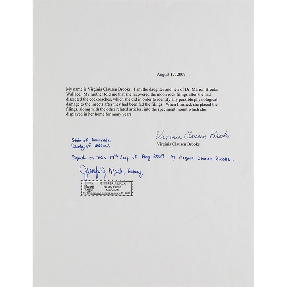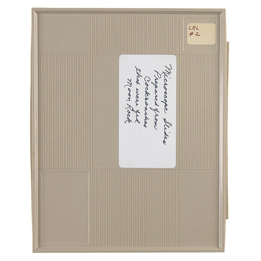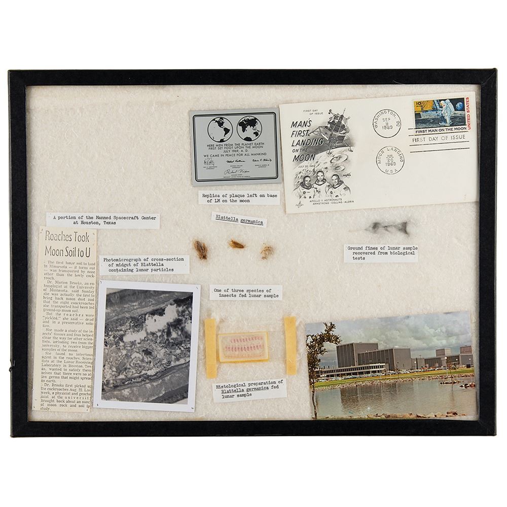 NASA keeps famously close guard over lunar material returned by the Apollo missions, making it virtually impossible to obtain. In this instance, while still inside the LRL, the material was subjected to destructive experimentation as it was fed to the cockroaches. The dead cockroaches were then transferred to Dr. Brooks for further examination at the University of St. Paul. This cockroach experiment is known to exist in public, with several newspaper articles published over the years and a prior auction of this lot by Regency Superior (lot number 191, April 2010). Documentation is included on our website.