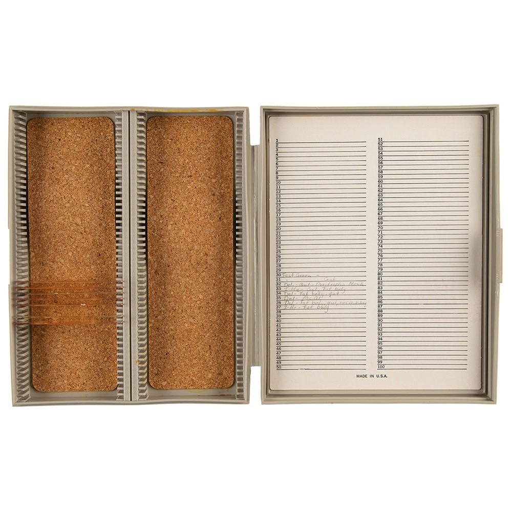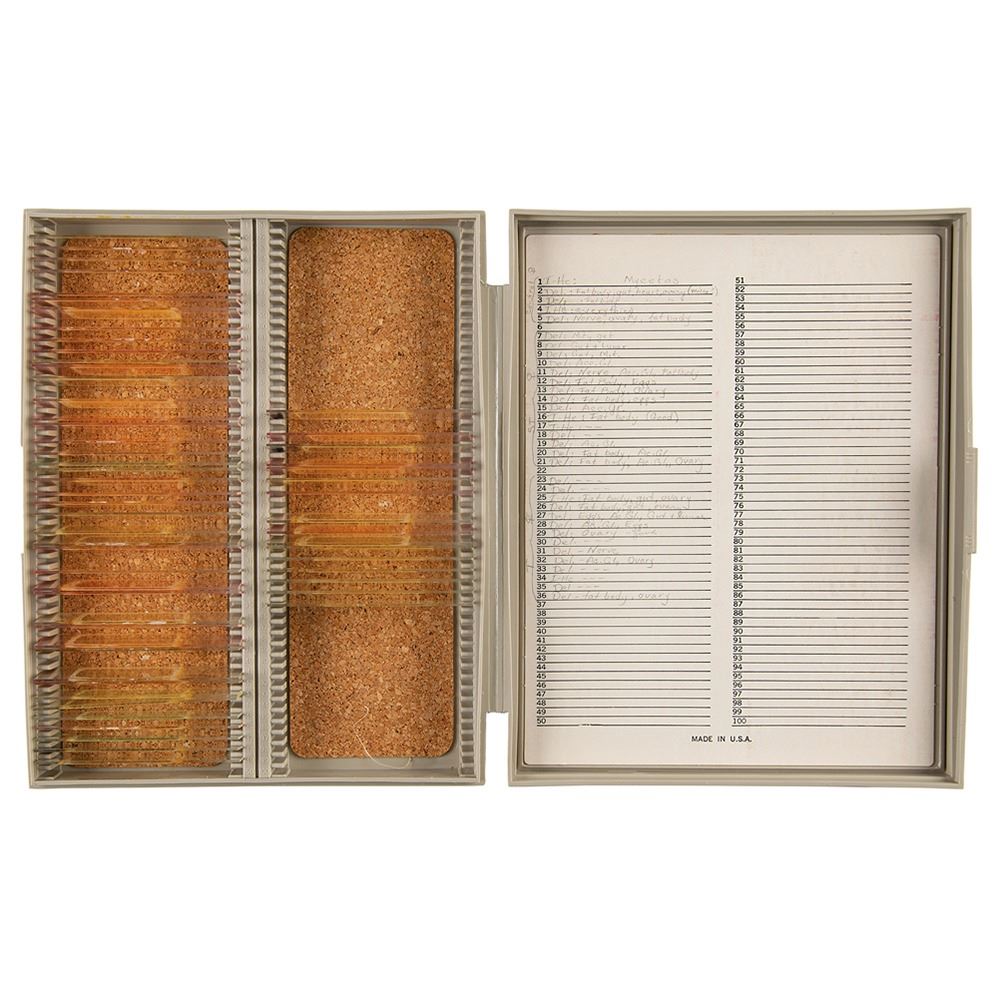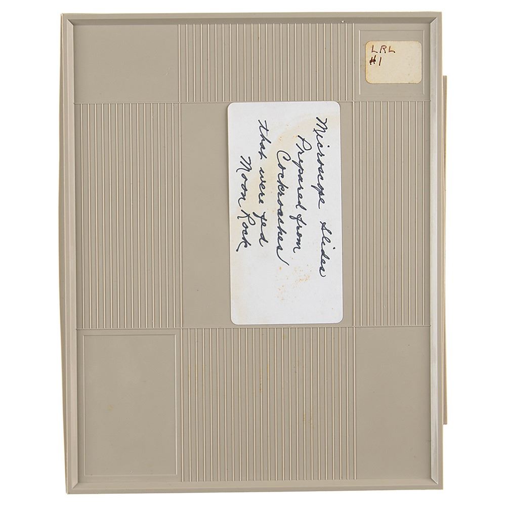 Also includes two cases of "Microscope Slides Prepared from Cockroaches that were fed Moon Rock," marked "LRL #1" and "LRL #2." Combined, the cases contain a total of 66 glass slides prepared with histological samples from the control and experimental groups. Contents of the slides are identified on tables inside the case lids, though they may no longer be arranged in the matching order.