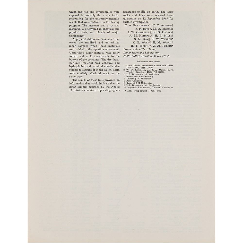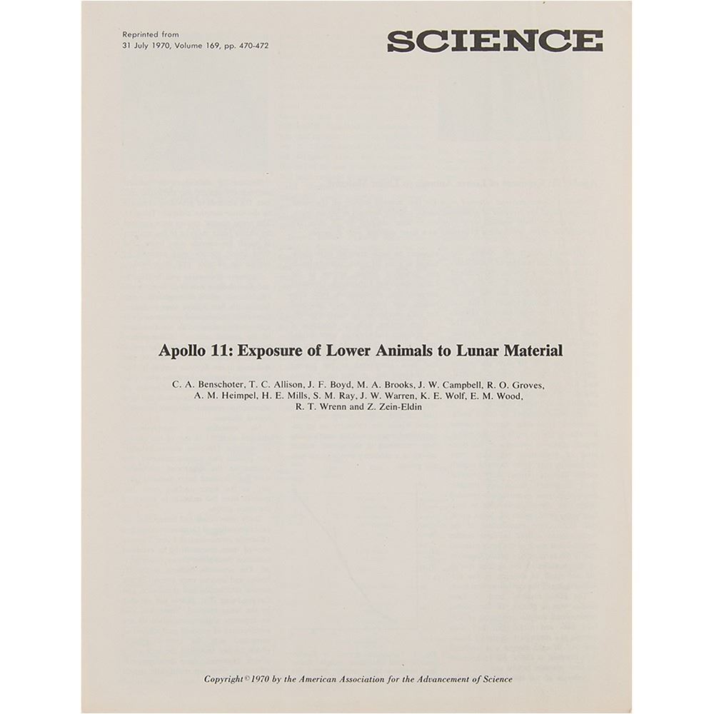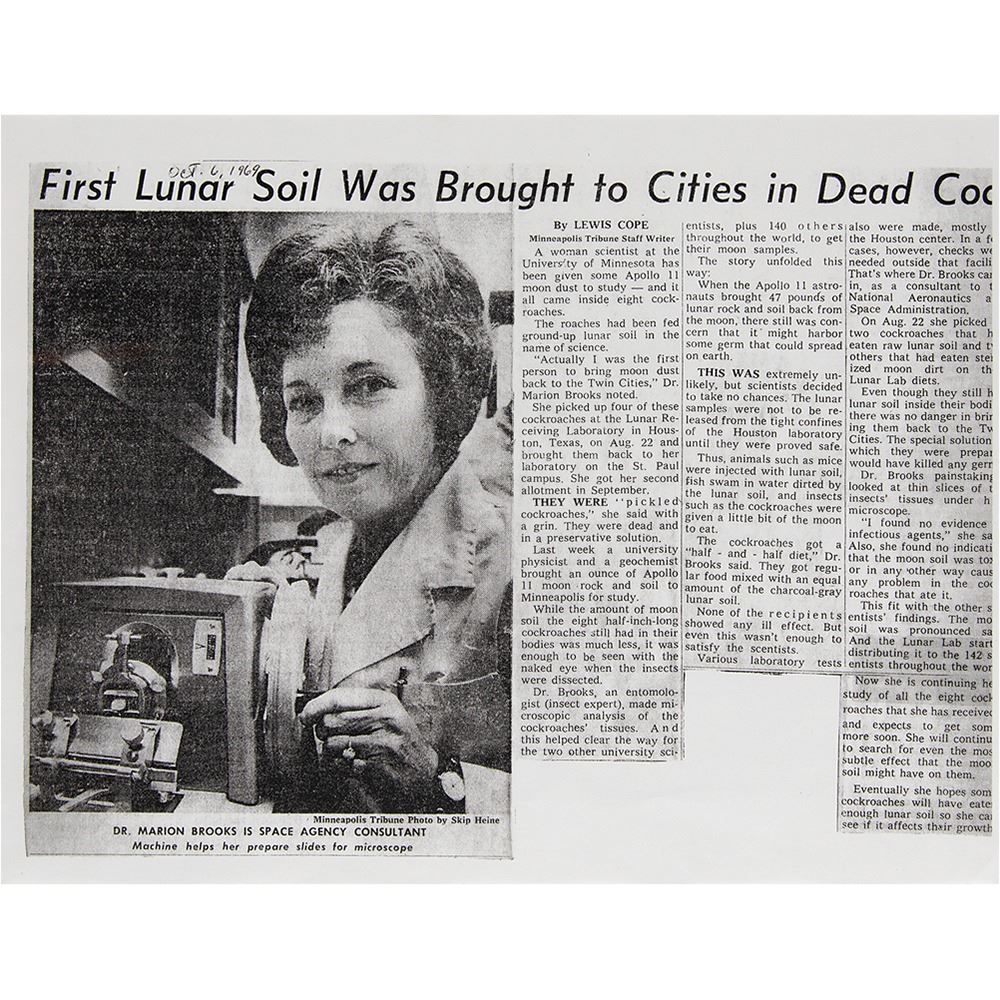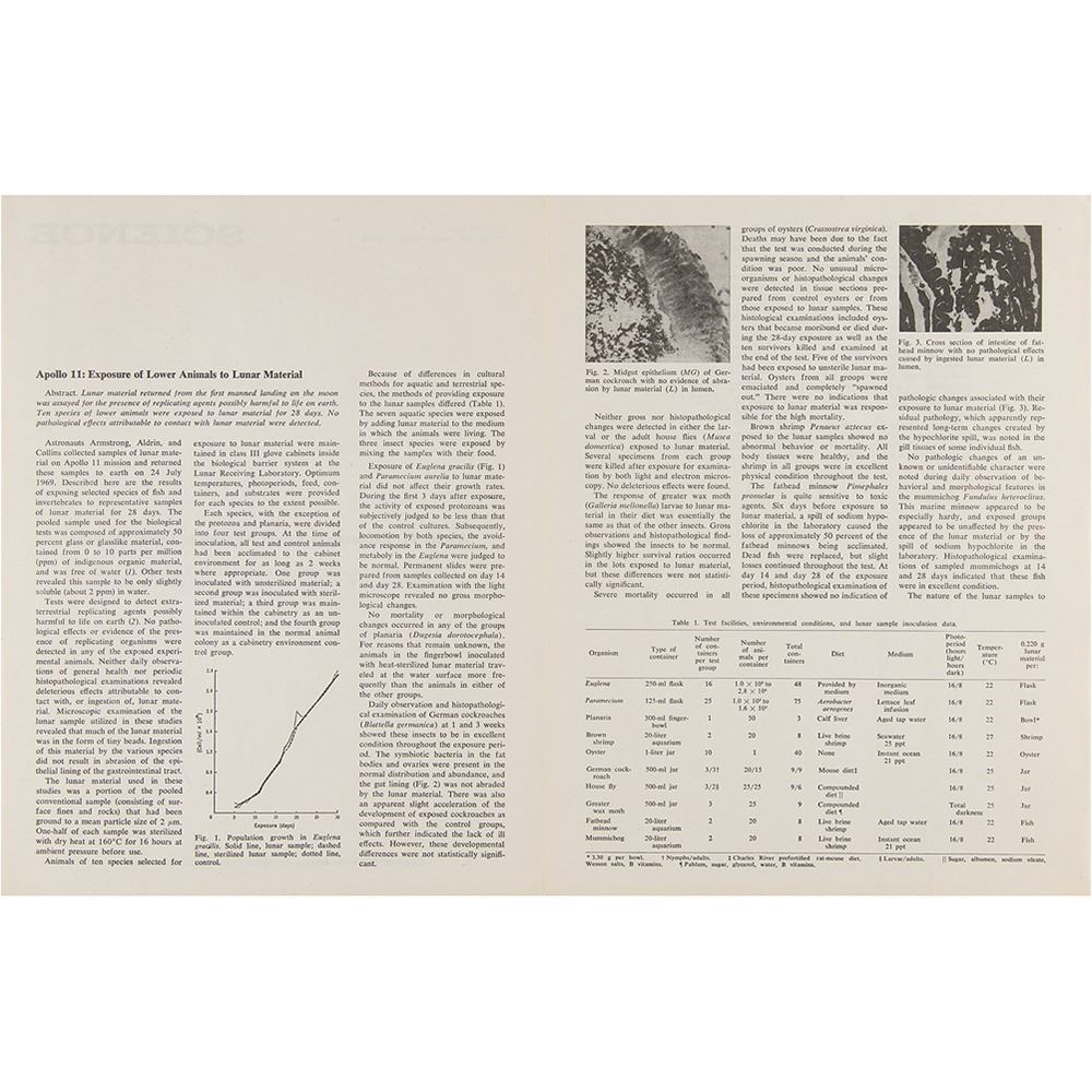 Following this initial experiment, Dr. Brooks was tasked with dissecting the cockroaches to prepare histological sections on glass slides. She then examined them for evidence of pathological conditions caused by ingestion of the extraterrestrial material. She found no evidence of disease or pathogens, and was surprised to observe that the lunar particles caused no damage to the cockroaches' stomach cells. Includes an original offprint of the journal article 'Apollo 11: Exposure of Lower Animals to Lunar Material,' published by Brooks and colleagues in the July 31, 1970, issue of Science, discussing their findings.