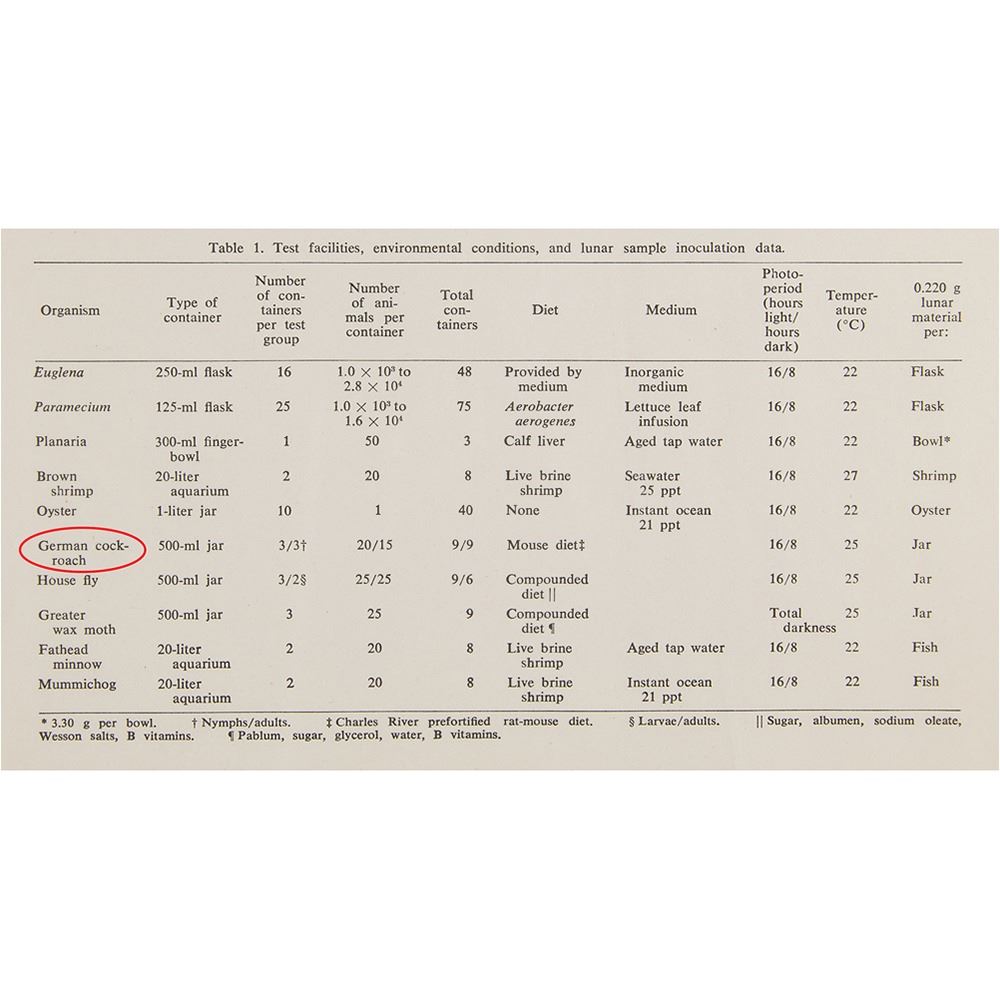 The article 'Moon Dust and Cockroaches,' published in Minnesota Science, describes the experiment at length: the Apollo 11 astronauts returned to Earth with some 47.5 lbs of moon rock, which was quarantined in a vacuum chamber for several weeks. The scientists studying invertebrate life then received about 4.5 pounds of the material, and ground it up into small particles for their studies on microscopic organisms, insects, and aquatic life. Insects were exposed to the lunar particles by mixing it with their food, and aquatic species had it introduced to their tanks. None of the individuals that died during the experiment met their demise as a result of lunar dust exposure. These experiments were carried out within the Lunar Receiving Laboratory (LRL).