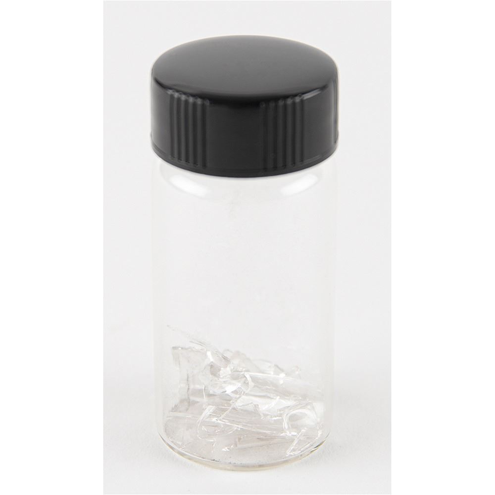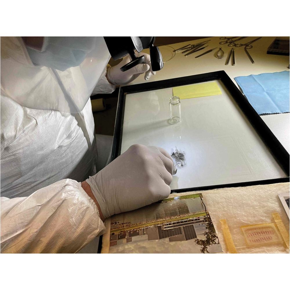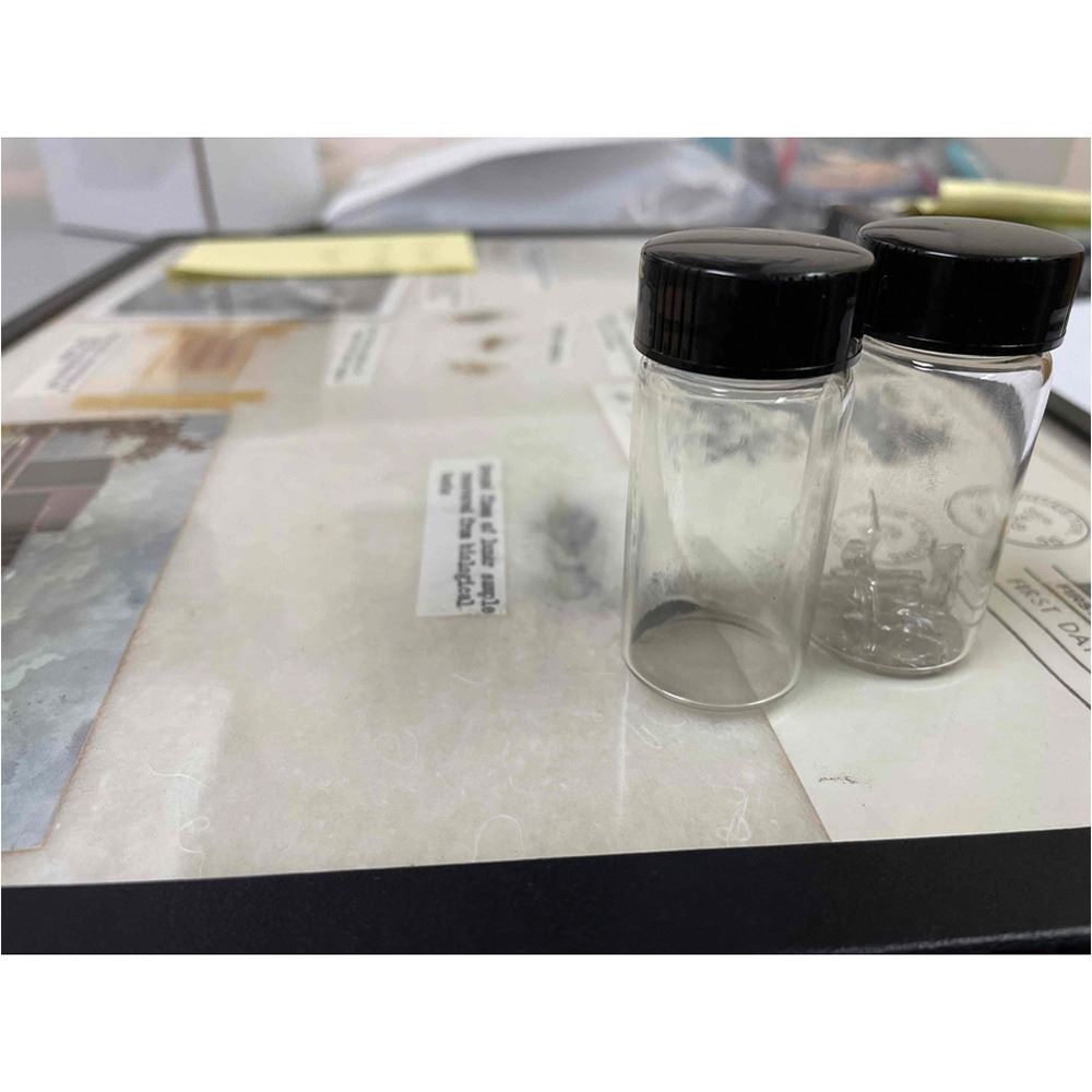 Extraordinary specimen display from an Apollo 11 lunar dust experiment, in which German cockroaches (among other lower creatures) were fed lunar soil material in order to observe potential pathological effects. The display housed a vial of ground fines of material extracted from the cockroaches following the biological tests, three of the preserved Blattella germanica cockroaches, and a glass slide containing a histological preparation of Blattella germanica fed the lunar sample, among several images and souvenirs associated with man's first moon landing. The original vial of extracted material was broken, spilling its contents into the display; the gray discoloration in the white batting is the result. The ground fines and glass shards were then meticulously separated into two larger glass vials. The material weighs approximately 40 milligrams (mg).