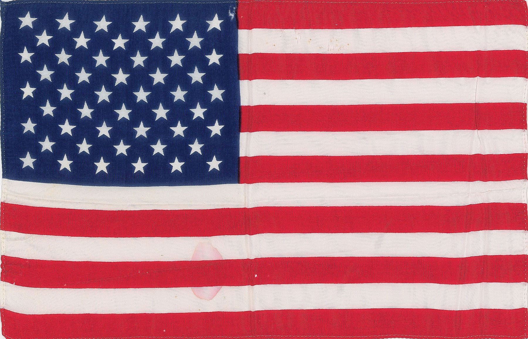 Extremely desirable flown mid-sized American flag carried to the lunar surface on Apollo 11 mission, 12 x 7.5, accompanied by a handwritten letter of provenance from former NASA Production Control Engineer William R. Whipkey, in full: "This American flag (12? x 7 1/2?) was flown on Apollo 11 to the lunar surface aboard Lunar Module #5, 'Eagle.' This flag was given to me by the crew upon their return, and has been in my possession ever since." In fine condition, with folds, a light stain to the bottom, and a few small areas of fabric loss to the top. Among his other duties, Whipkey was responsible for purchasing the items that were carried on the Apollo missions, including flags foreign and domestic. A skilled woodworker, Whipkey also created many displays and presentation pieces for the astronauts using flown materials, and often received flown items in return as tokens of their appreciation. A highly sought-after flown American flag carried to the moon during man's first voyage to the lunar surface.