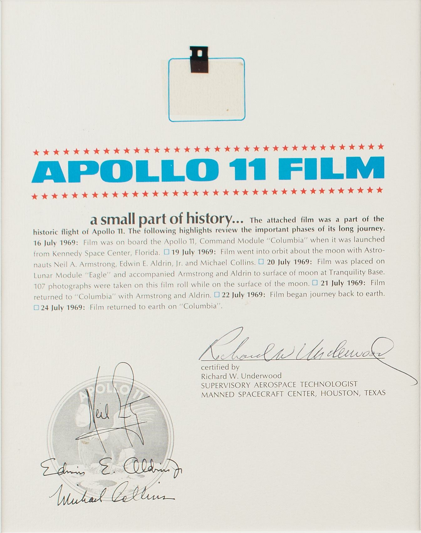 Flown .25 x .5 swatch of film carried to the lunar surface aboard the Lunar Module Eagle during the historic Apollo 11 mission. The swatch is affixed to a 8 x 10 certificate of authenticity signed in ballpoint by Richard W. Underwood, Supervisory Aerospace Technologist at the Johnson Space Center. The certificate details the chronology of the film from after liftoff until its return on board the CSM Columbia, stating that "107 photographs were taken on this film roll while on the surface of the moon," and features facsimile signatures of the full crew. Handsomely double-matted and framed with archival-grade materials with UV-protective Artglass AR99 Acrylic™ with an engraved plaque, embroidered NASA and Apollo 11 patches, and a photo of Buzz Aldrin descending the Eagle ladder to an overall size of 21.75 x 20. In fine condition. Underwood was responsible for developing the Apollo photographs—in fact, he was the first person to view every photograph from the Gemini, Apollo, Skylab, Apollo-Soyuz, and the first 23 space shuttle missions.