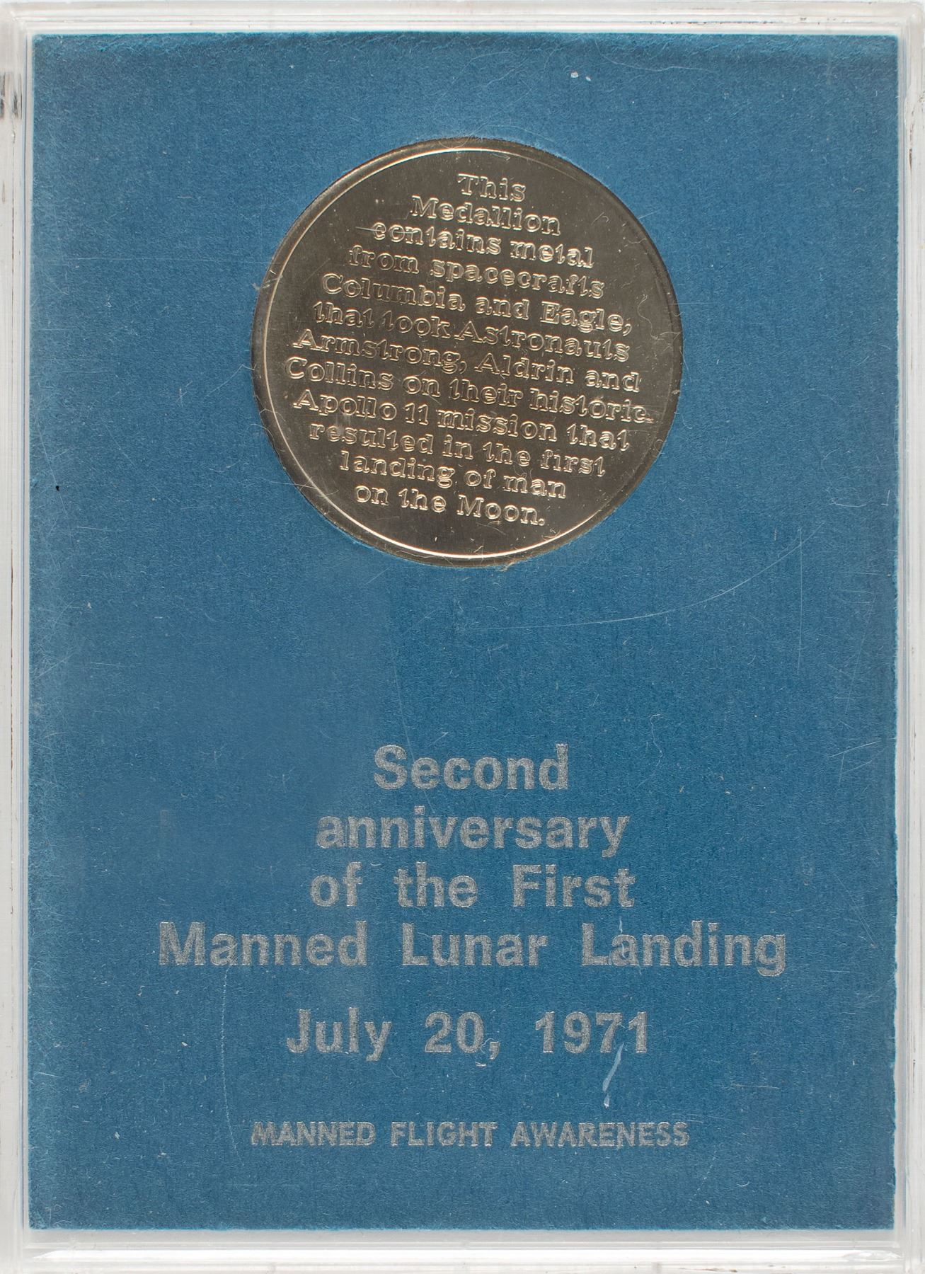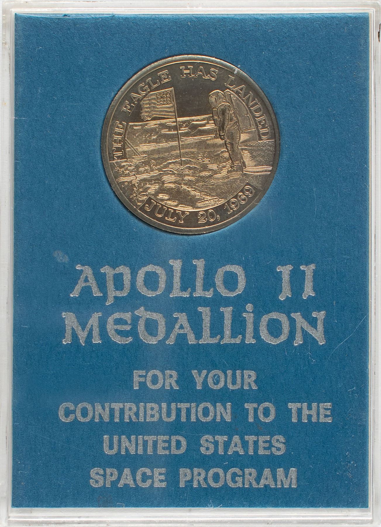 Manned Flight Awareness medallion, 1.25˝ in diameter, bearing a raised design of Buzz Aldrin on the moon, the landing date, and Armstrong’s iconic quote, “The Eagle Has Landed,” on the face, and the reverse with text in relief, “This Medallion contains metal from spacecrafts Columbia and Eagle, that took Astronauts Armstrong, Aldrin and Collins on their historic Apollo 11 mission that resulted in the first landing of man on the Moon.” Includes the original blue cardboard holder. In fine condition.