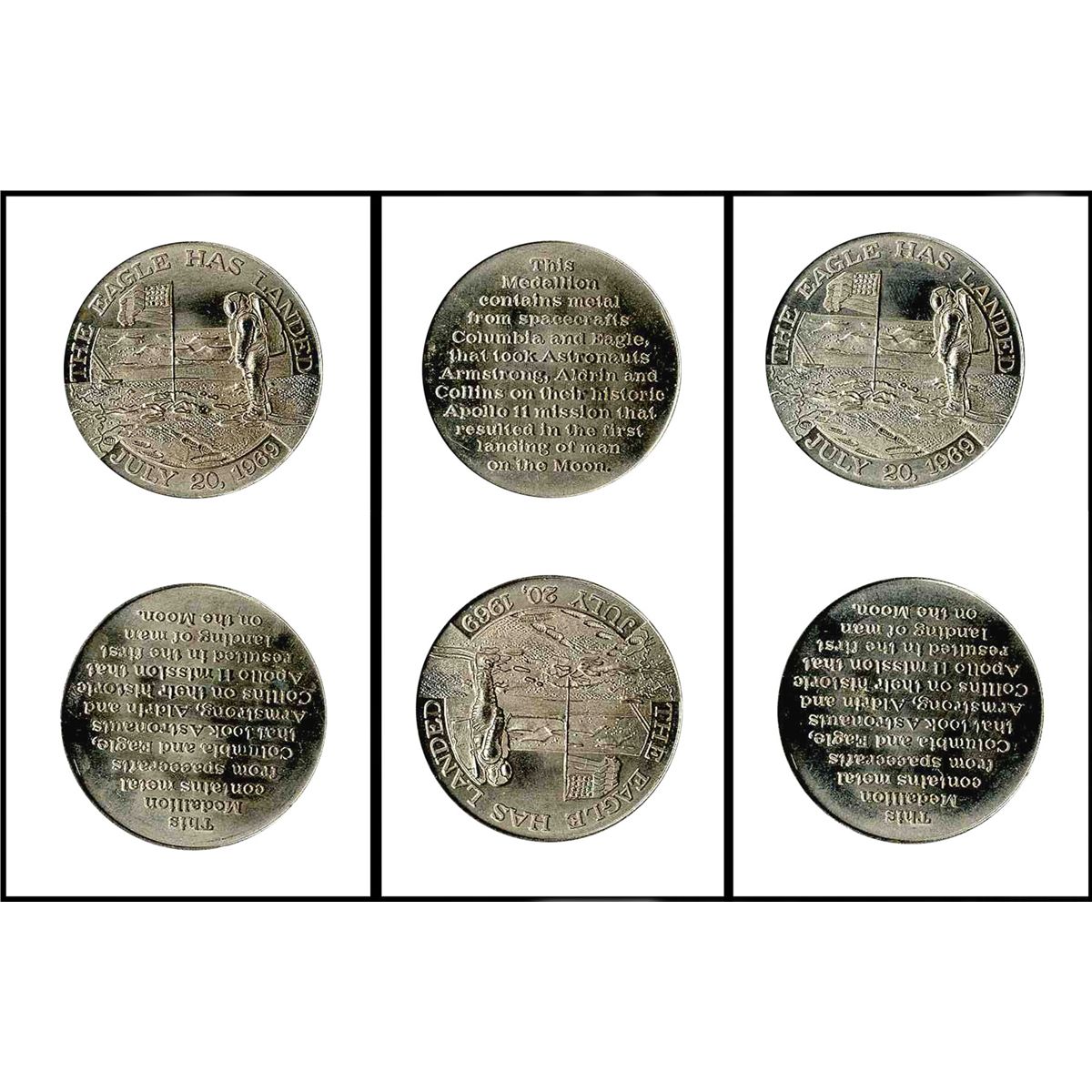 Unique Apollo 11 commemorative medallion comprised of metal from the mission's spacecrafts, ''Columbia'' and ''Eagle.'' Front of coin depicts the historic moment of the American flag being planted on the moon and verso of coin reads: ''This Medallion contains metal from spacecrafts Columbia and Eagle, that took Astronauts Armstrong, Aldrin and Collins on their historic Apollo 11 mission that resulted in the first landing on the Moon.'' Coin measures 1.25'' in diameter. Fine condition.