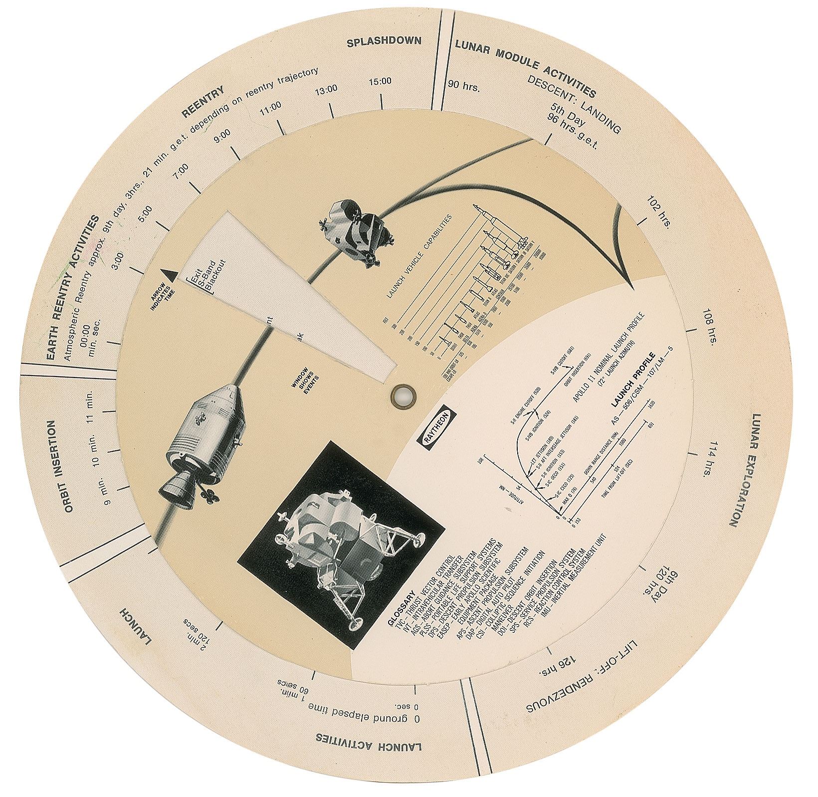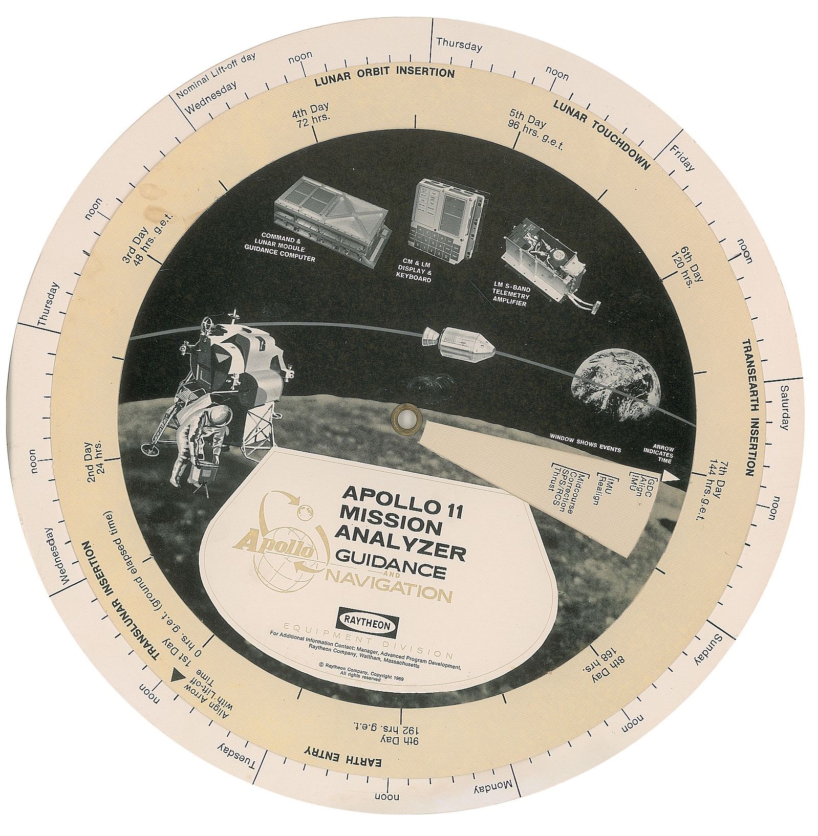 A circular cardstock "Apollo 11 Mission Analyzer" rotating chart made by Raytheon in 1969, measuring 9.5? in diameter, providing a guide for the mission's timeline and activities. In fine condition.