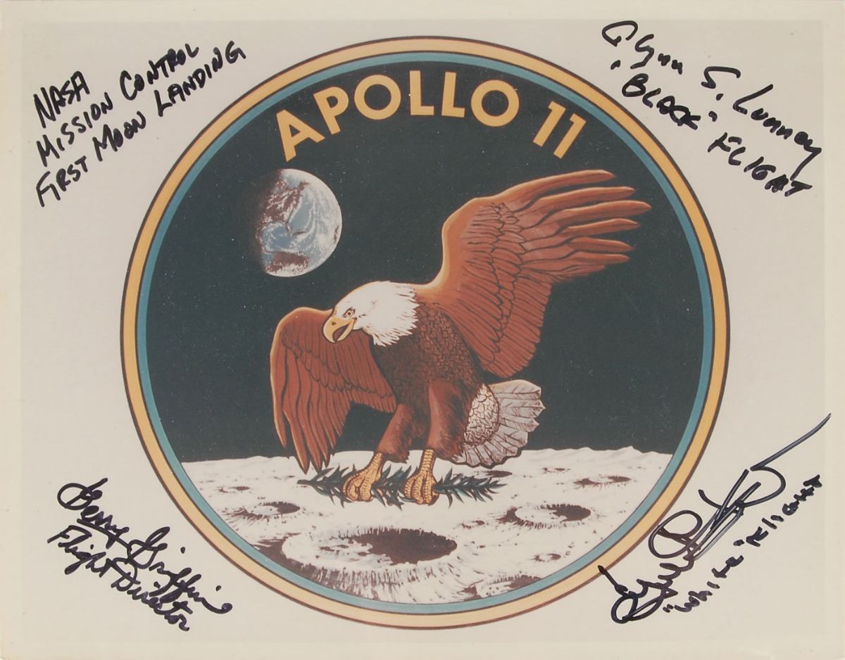 Official color glossy 8 x 10 NASA photo of the Apollo 11 mission insignia, signed in black felt tip by three members of mission control, including: “NASA Mission Control, First Moon Landing, Gerry Griffin, Flight Director,” “Glynn S. Lunney, ‘Black’ Flight,” and “Gene Kranz, ‘White’ Flight.” In fine condition.