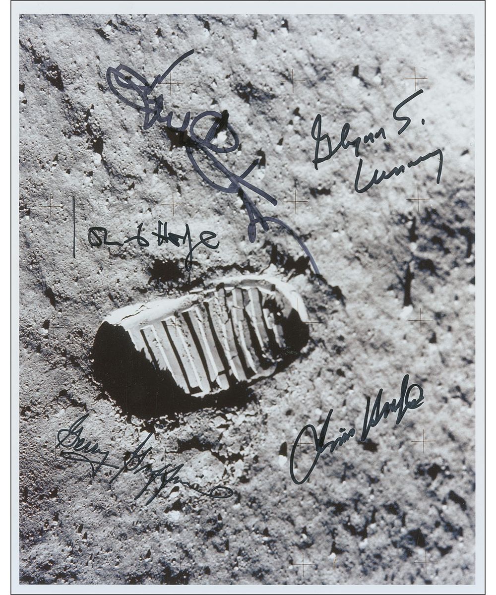 Beautiful color satin-finish 8 x 10 photo of a footprint on the lunar surface, signed in black felt tip by mission control personnel Gene Kranz, Chris Kraft, Gerry Griffith, John Hodges, and Glynn Lunney. In very fine condition.