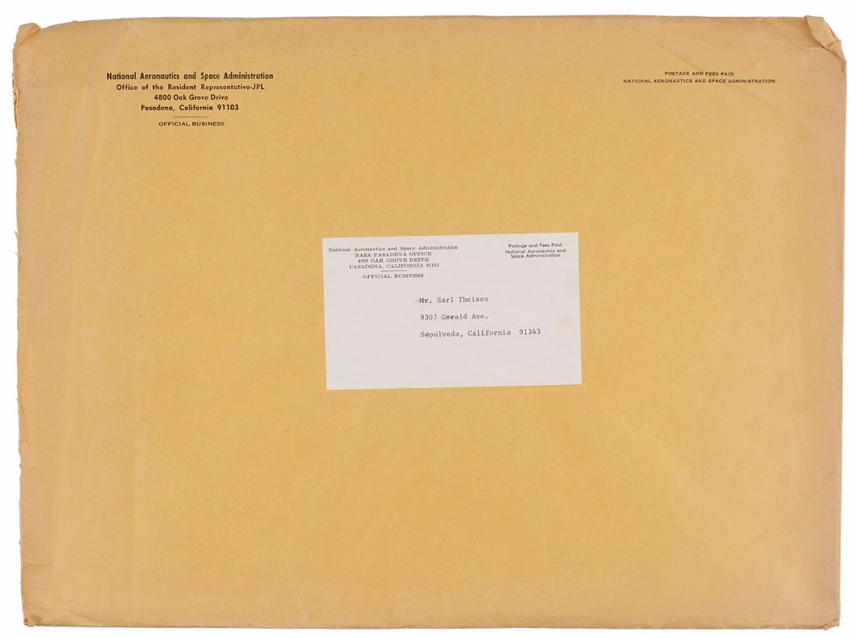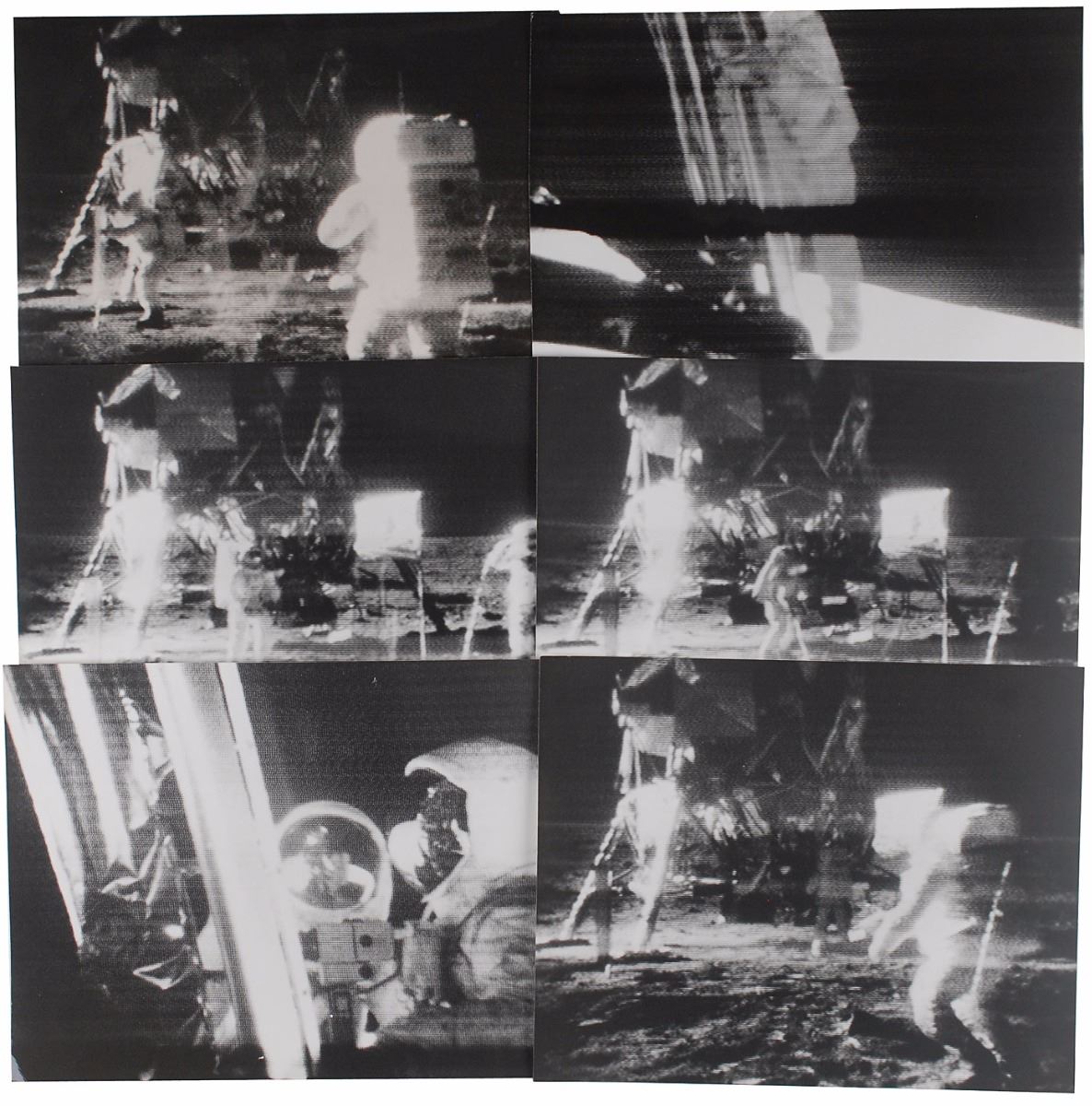 Six original glossy 13.5 x 10.5 photographs of Armstrong’s first steps on the lunar surface, five of which have official caption labels affixed to the reverse. In fine condition, with light surface bends and creases, and a grainy quality to the images. Accompanied by the original NASA mailing envelope addressed to Earl Theisen (1903–1973), a press photographer who worked for Look magazine.