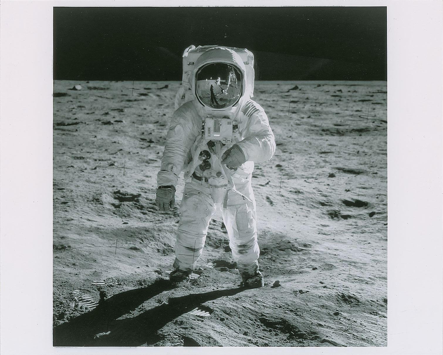 Choice crystal-clear original glossy 14 x 11 silver gelatin photograph of Buzz Aldrin on the lunar surface, with Neil Armstrong reflected in his visor. Reverse bears "A Kodak Paper" watermarks. In fine condition.