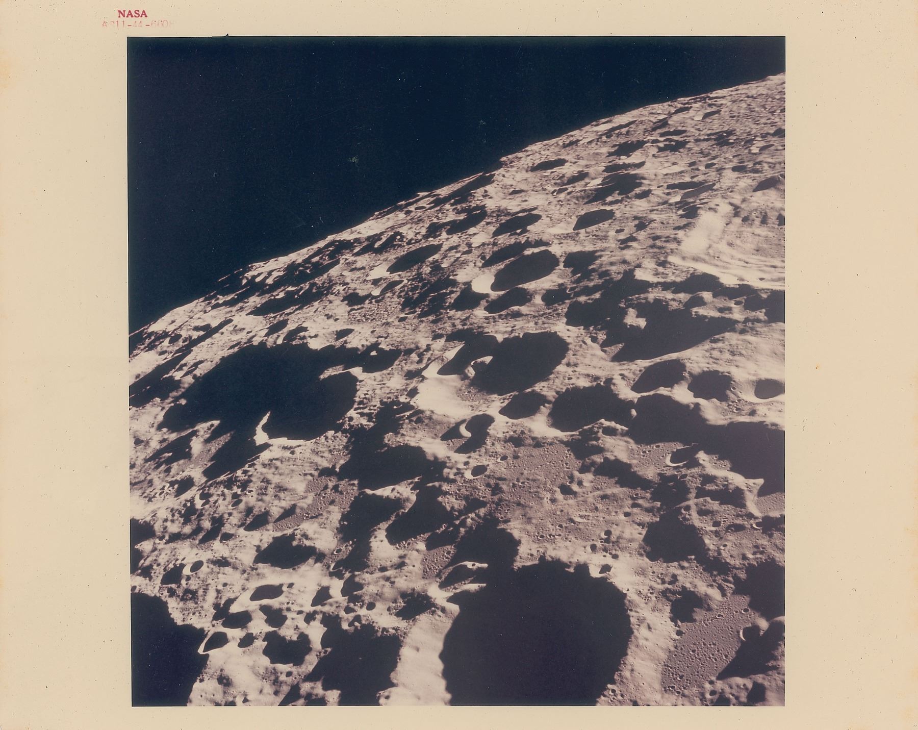 Official color glossy 10 x 8 red-numbered NASA photo (AS11-44-6608), which shows the rough terrain on the far side of the moon as seen during the Apollo 11 mission. Reverse bears "A Kodak Paper" watermarks. In fine condition.