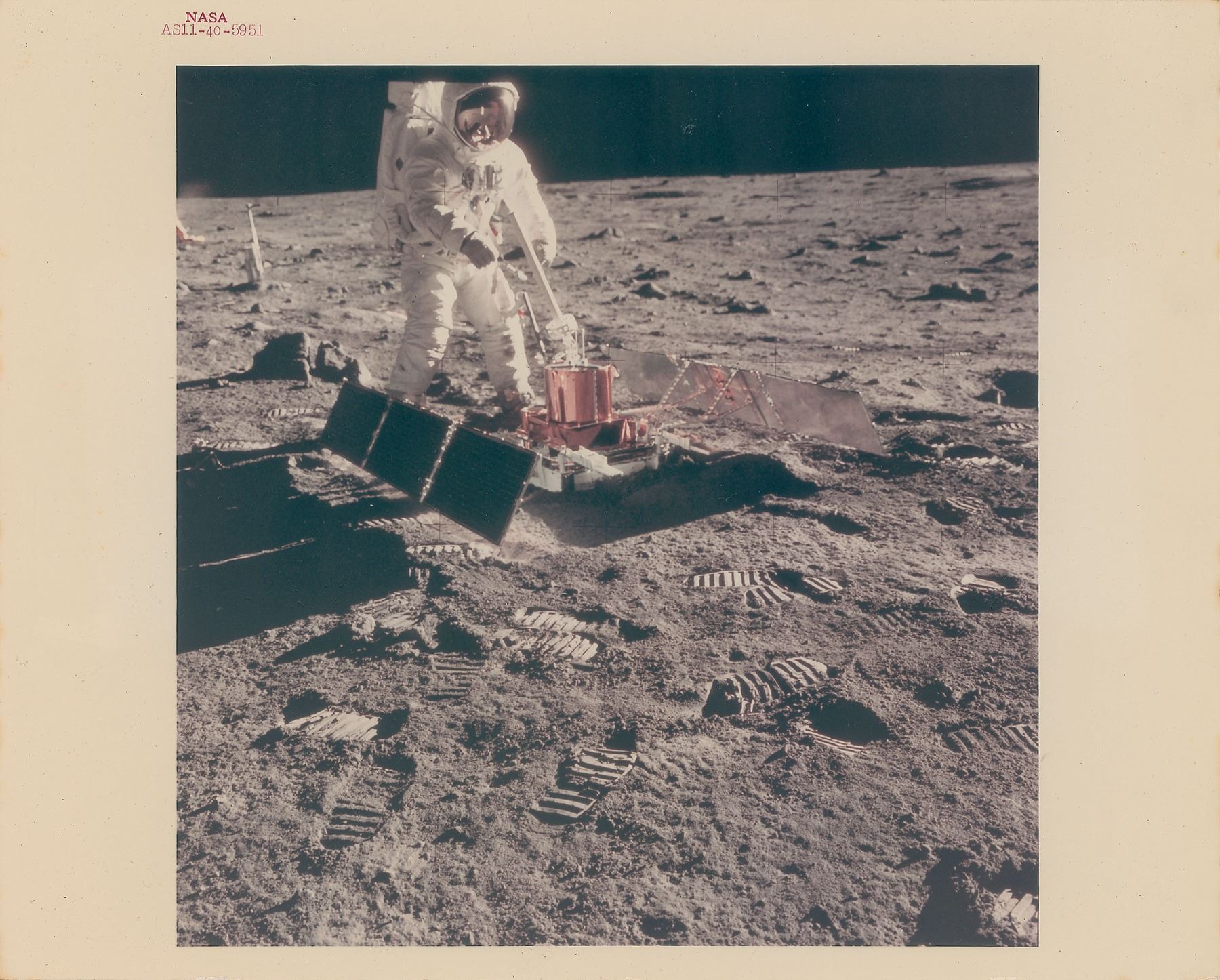 Official color glossy 10 x 8 red-numbered NASA photo (AS11-40-5951), which shows Apollo 11 LMP Buzz Aldrin deploying the Passive Seismic Experiment, designed to monitor moonquakes, volcanic activity, and meteor impacts. Reverse bears "A Kodak Paper" watermarks and an affixed caption. In fine condition.