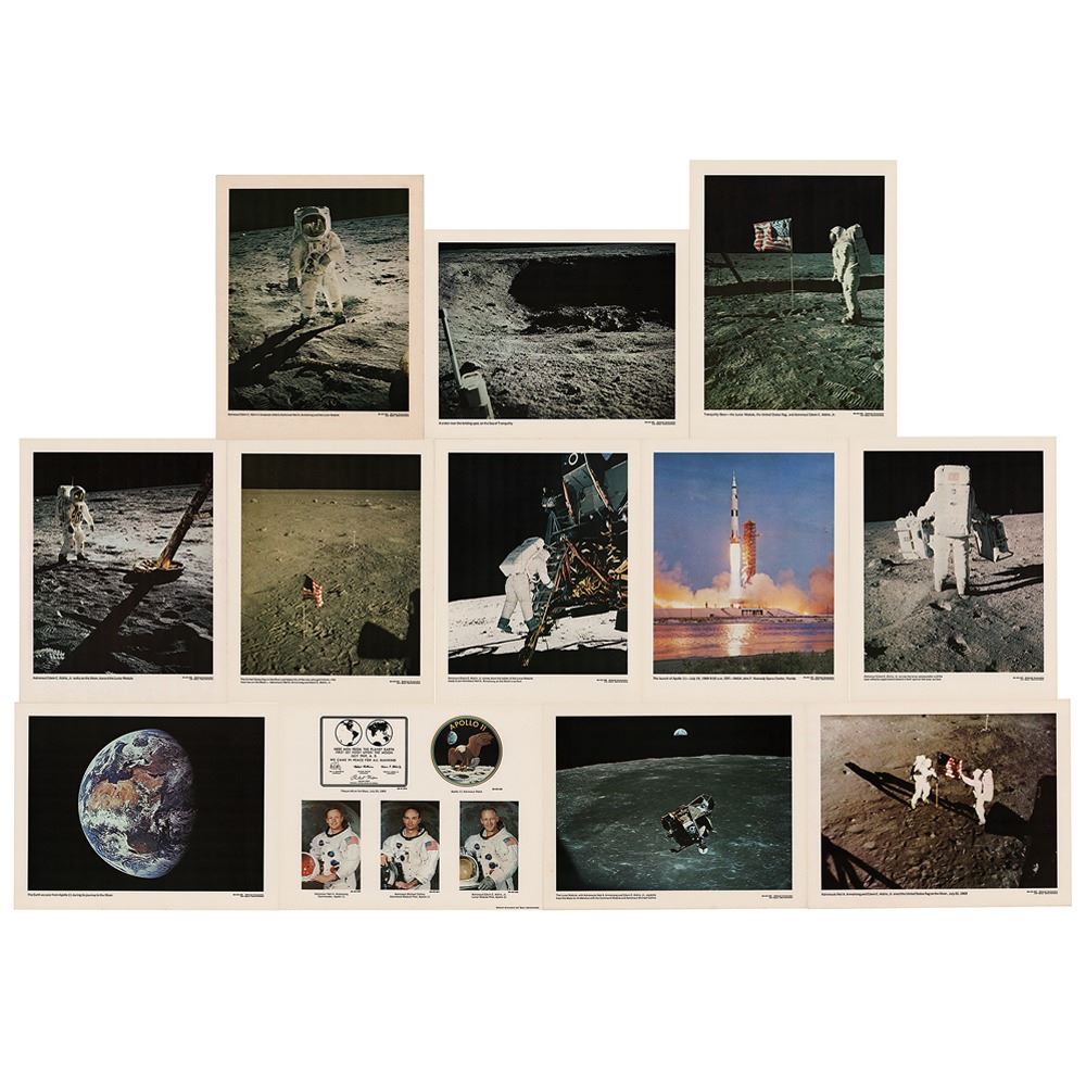 Twelve official color 11 x 14 NASA lithographs of iconic views from the Apollo 11 mission from the collection of Otto Berg. Includes: the Apollo 11 liftoff, Neil Armstrong and Buzz Aldrin deploying the flag on the lunar surface, Aldrin at the foot of the Lunar Module 'Eagle,' Aldrin with the American flag at Tranquility Base, the classic 'visor' shot of Aldrin walking on the moon, the LM during its ascent with Earth in the background, and other great images from the mission. Housed in their original NASA envelope. In overall fine condition.