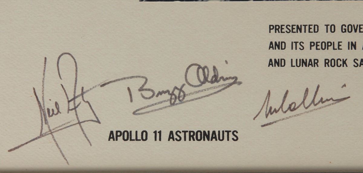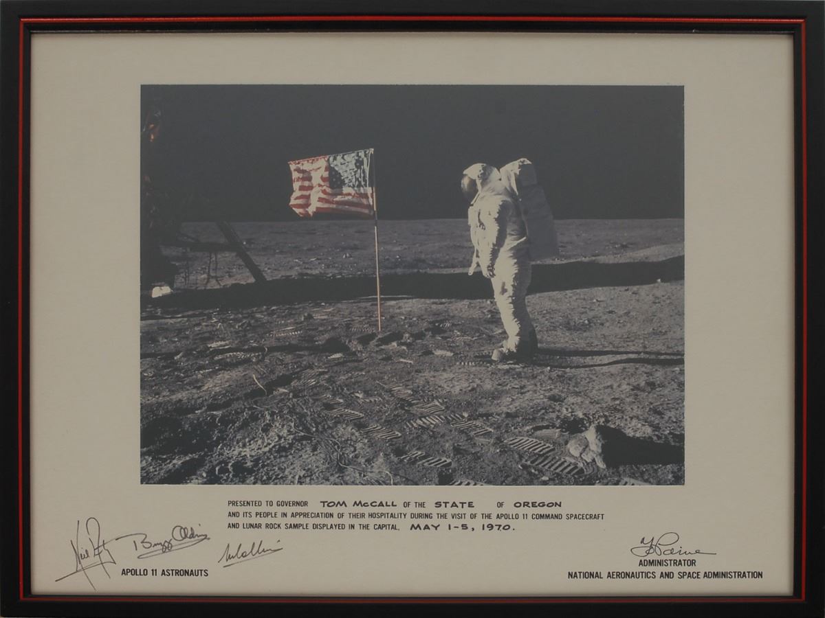 Color satin-finish 14 x 11 photo of Buzz Aldrin on the lunar surface with the American flag, affixed to its original 20 x 16 mount, filled out in a partly-printed area, “Presented to Governor Tom McCall of the State of Oregon and its people in appreciation of their hospitality during the visit of the Apollo 11 command spacecraft and lunar rock sample displayed in the capital, May 1–5, 1970,” and signed in black felt tip, “Neil Armstrong,” “Buzz Aldrin,” and “M. Collins.” Also signed by NASA Administrator Thomas O. Paine. In fine condition. Following the successful lunar landing and recovery of moon rocks on Apollo 11, President Richard Nixon distributed commemorative plaques containing specimens of lunar material to each of the 50 states. Governor Tom McCall received the Oregon ‘goodwill moon rocks’ on his state’s behalf, and to this day they remain on display at the Oregon State Capitol. A beautiful piece boasting ideal examples of the Apollo 11 crew’s vintage signatures.
