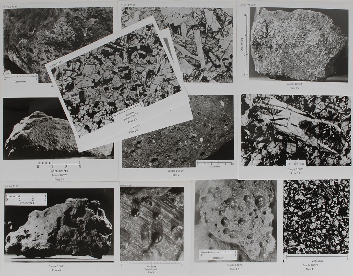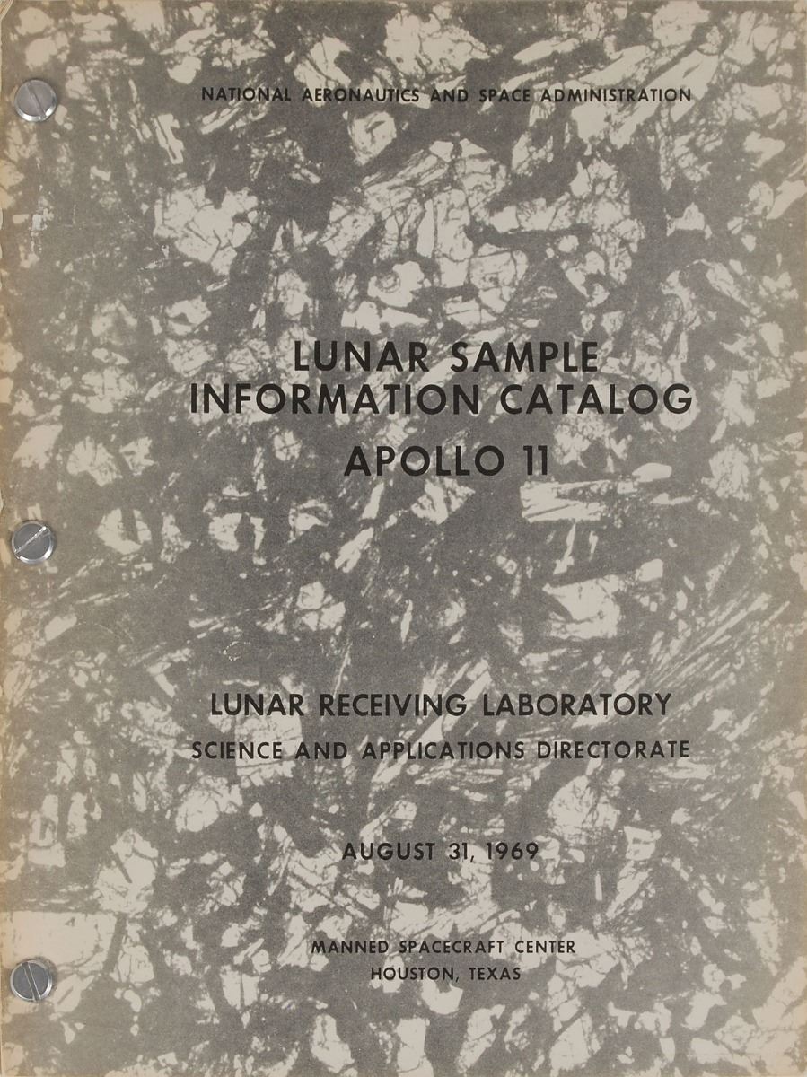 Two rare official NASA reports: one volume entitled “Lunar Sample Information Catalog, Apollo 11,” produced by the Lunar Receiving Laboratory, 8 x 10.5, 412 pages, August 31, 1969; and a volume entitled “Mineralogy and Petrology of the Apollo 11 Lunar Sample,” produced by the Smithsonian Astrophysical Observatory, Special Report 307, 8.5 x 11, 99 pages, January 9, 1970. The rarer Lunar Sample Information Catalog includes twelve glossy photographs held within an envelope at the rear. In overall fine condition, with some toning to cover borders. Published just 38 days after the Apollo 11 splashdown, the Lunar Sample Information Catalog was produced as a ‘rush order’ to showcase the tangible results of the first manned mission to the moon. Both of the reports offered here are extremely scarce.
