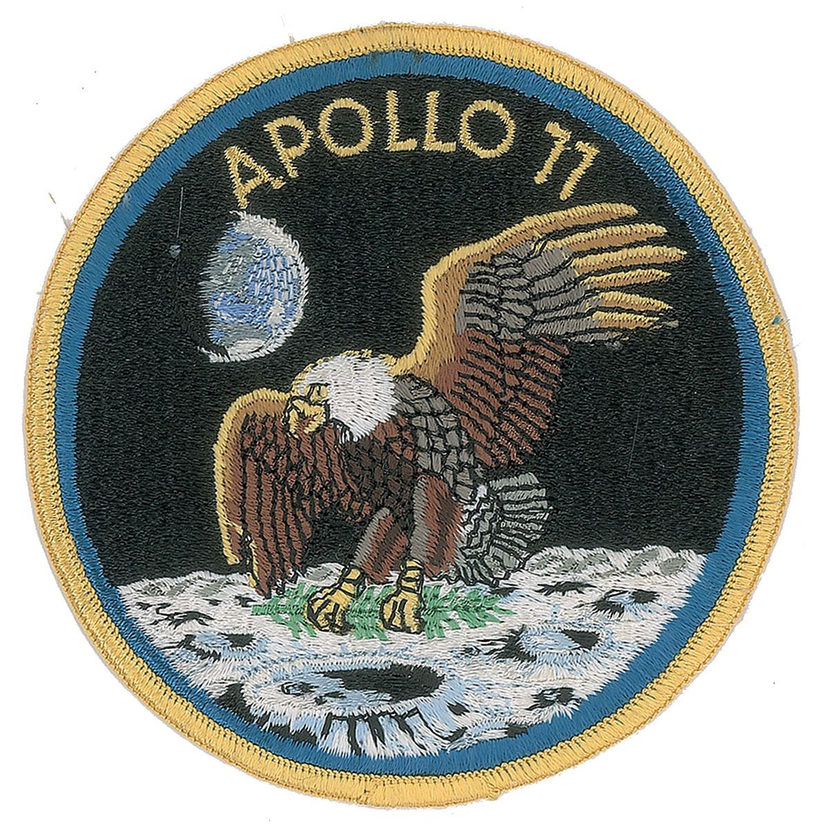 Exceptionally rare Apollo 11 Texas Art Embroidery crew patch, measuring 4? in diameter. In fine condition. This patch design was worn by the crew on their Biological Isolation Garments at recovery time and then later on their blue post-flight jump suits. The patch was released in very limited quantity and only made available to the crew and NASA employees.
