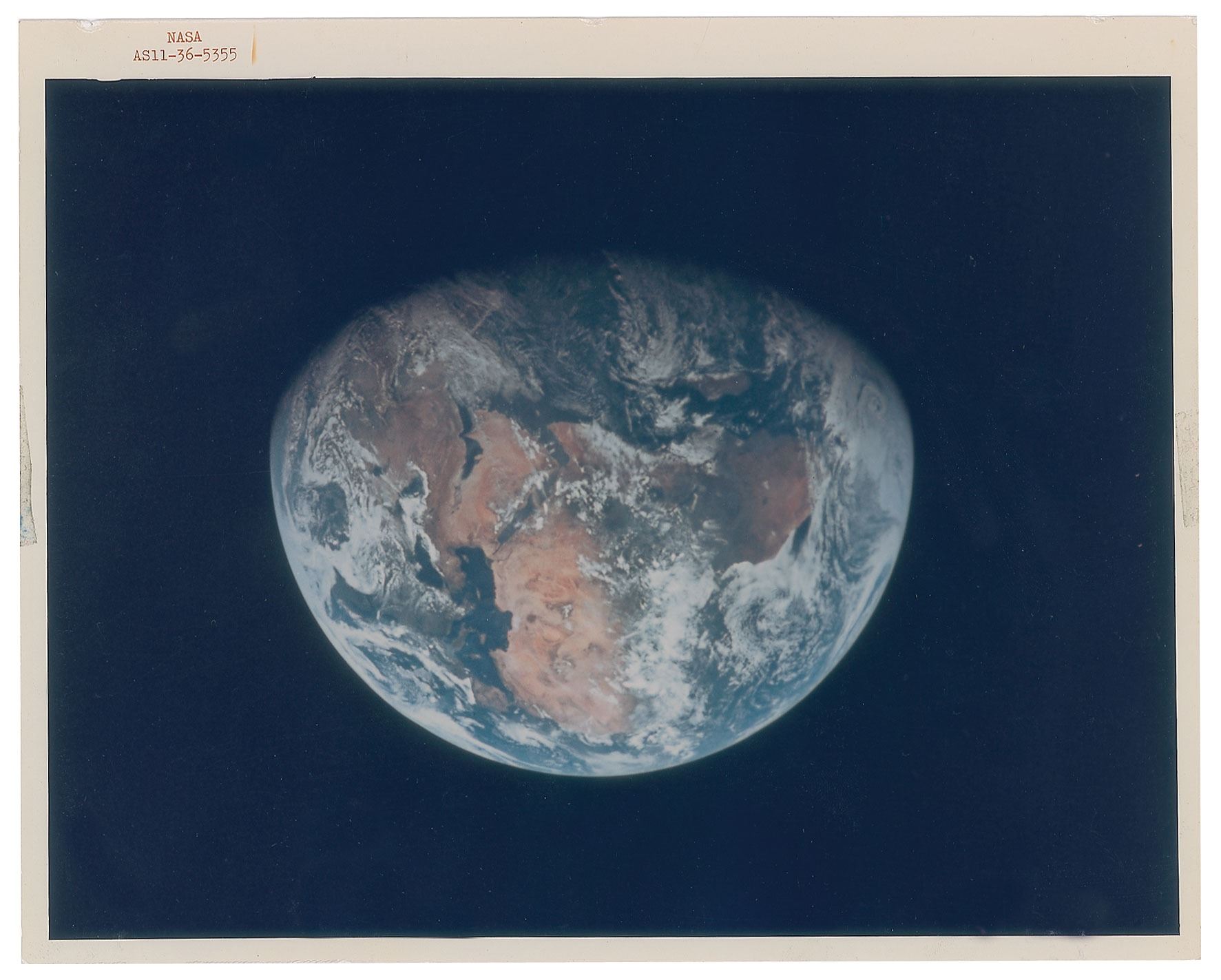 Official glossy 10 x 8 red-numbered NASA photo of the planet Earth as viewed from outer space during the Apollo 11 mission. Reverse bears "A Kodak Paper" watermarks and purple NASA caption text, which reads, in part: "Most of Africa and portions of Europe and Asia can be seen in this spectacular photograph taken from the Apollo 11 spacecraft during its translunar coast toward an historical lunar landing." In fine condition, with some trivial scuffing to the image, and some old tape residue to the side borders. Aldrin discusses the view from this vantage point in his letter in lot 326.