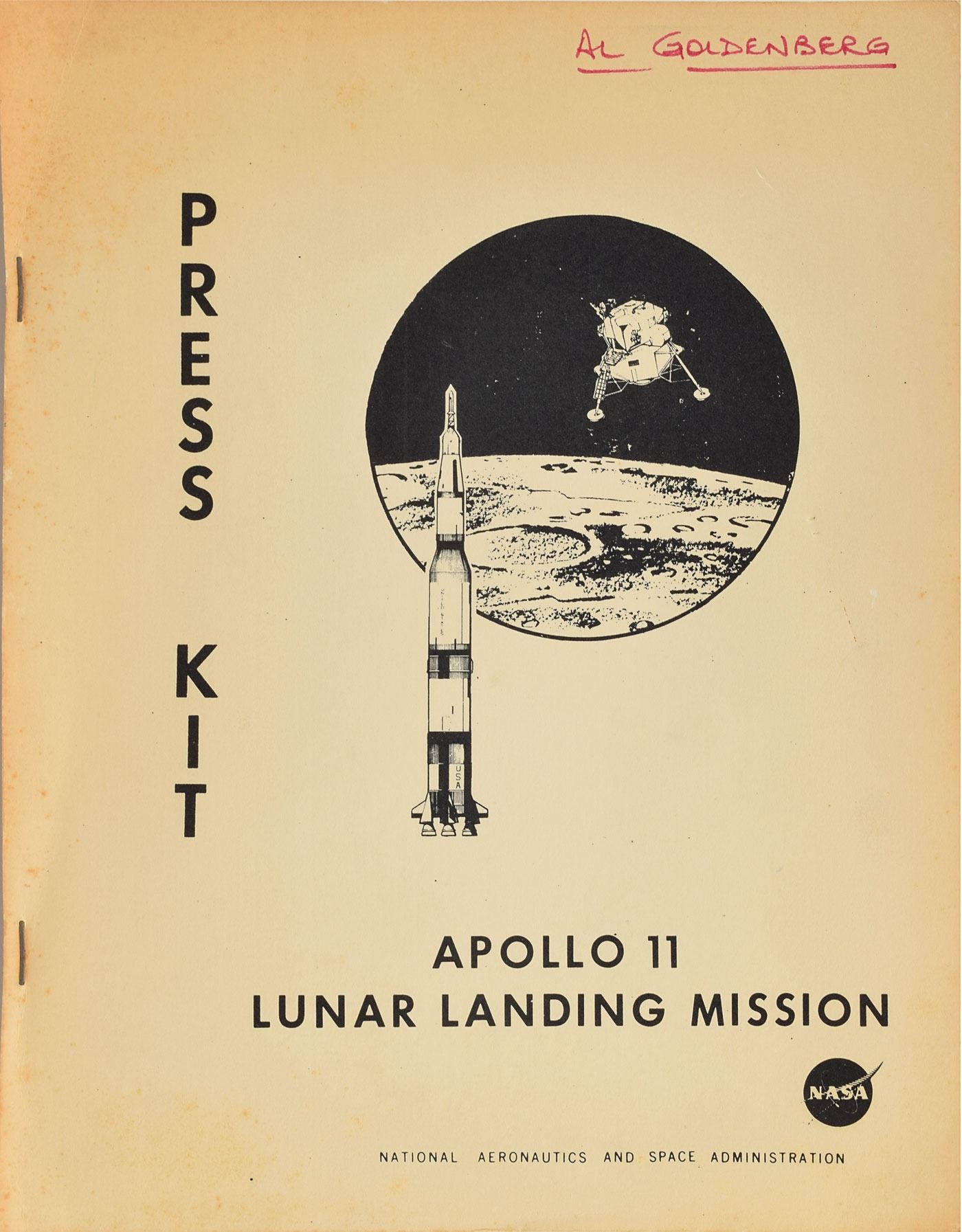 Staple-bound official Apollo 11 press kit manual published by NASA, 8.5 x 11, 250 pages, dated June 26, 1969. The manual, marked "Al Goldenberg" on the front cover, provides detailed information and diagrams related to the first moonwalks, and is divided into several sections: General Release, Apollo 11 Countdown, Launch Events, Apollo 11 Mission Events, Mission Trajectory and Maneuver Description, Recovery Operations, Quarantine, Schedule for Transport of Samples, Spacecraft & Crew, Lunar Receiving Laboratory Procedures Timeline, Apollo 11 Go/No–Go Decision Points, Apollo 11 Alternate Missions, Abort Modes, Onboard Television, Photographic Tasks, Lunar Description, Command and Service Module Structure, Systems, Lunar Module Structures, Weight, Saturn V Launch Vehicle Description & Operation, Apollo 11 Crew, Early Apollo Scientific Experiments Package, Apollo Lunar Radioisotopic Heater, Apollo Launch Operations, Launch Complex 39, Manned Space Flight Network, Contamination Control, Apollo Program Management, and Principle Investigators and Investigations of Lunar Surface Samples. In fine condition, with light toning to the cover.