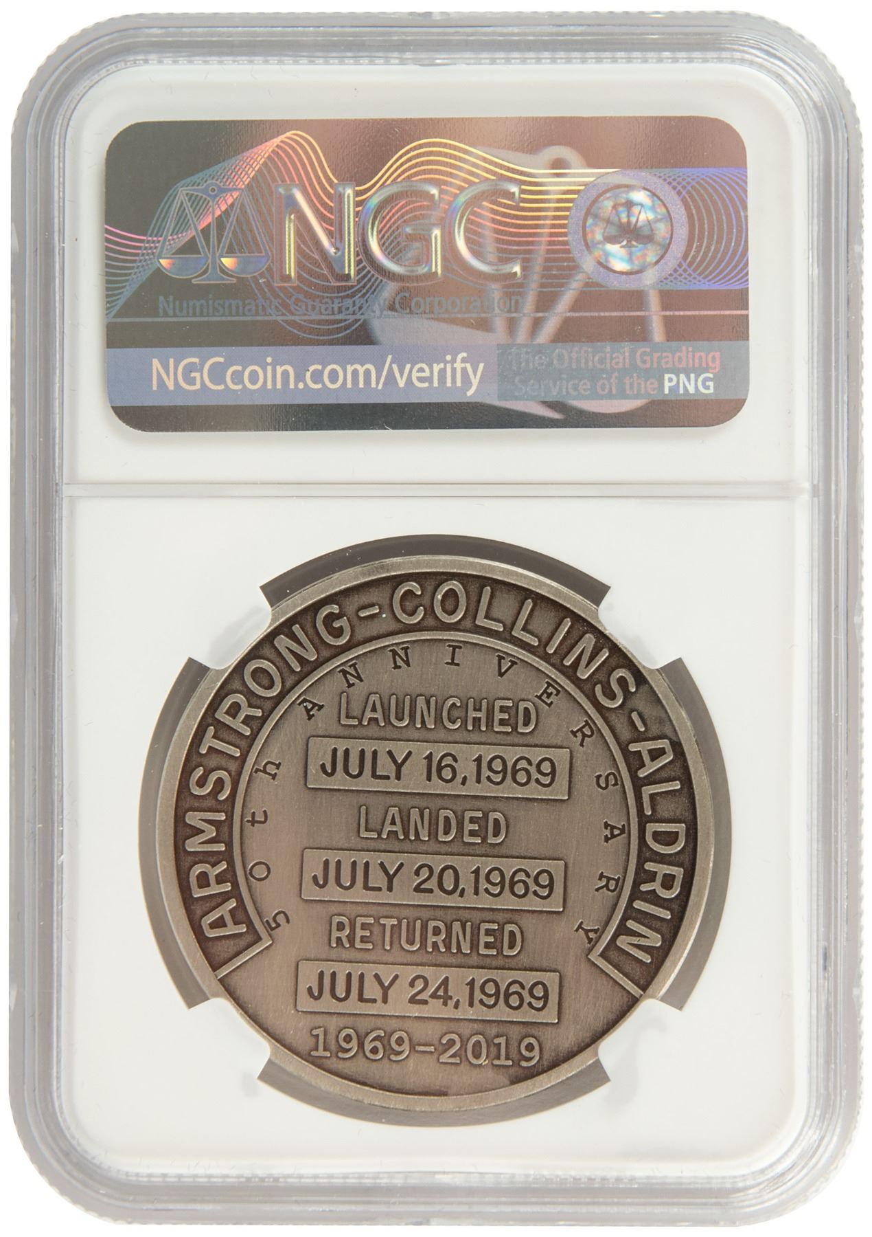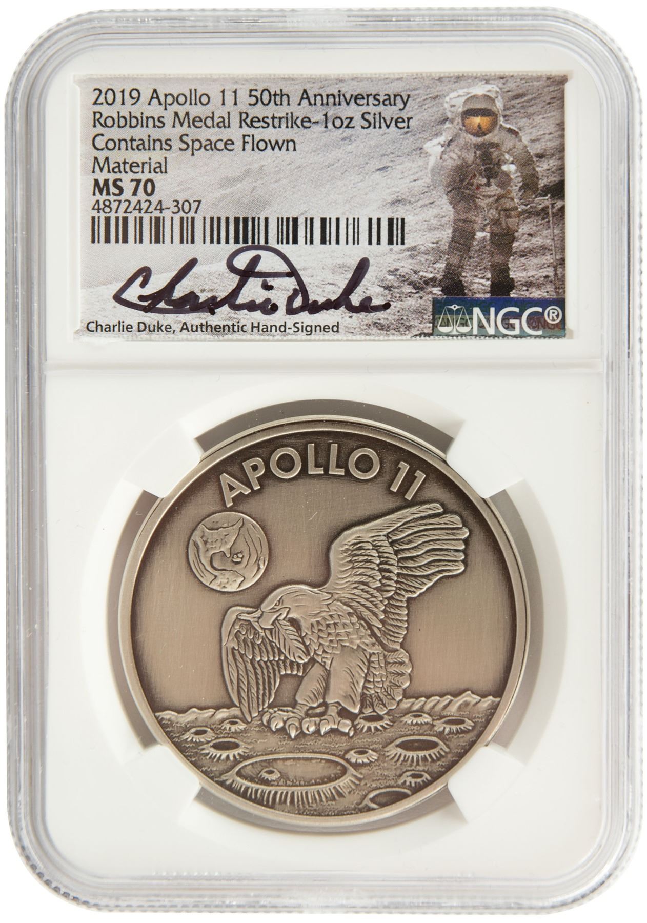 Apollo 11 Robbins medal restrike created for the 50th anniversary of the mission, struck from one ounce of silver containing space-flown material, and encapsulated by NGC with an authentic Charlie Duke signature on the label. The 38 mm medal features the same design as the original Robbins medallion: the face featuring an early design of the iconic Apollo 11 mission insignia raised in high relief, showing the eagle carrying the olive branch in its beak. The reverse bears the last names of astronauts Neil Armstrong, Buzz Aldrin, and Michael Collins, and is engraved with the launch date of July 16, 1969; moon landing date of July 20, 1969; and return date of July 24, 1969, along with the anniversary dates, "1969–2019." Encapsulated and graded by NGC as "MS 70." Also included is a 1-oz copper restrike of the Apollo 11 Robbins medal, encapsulated and graded by NGC as “GEM Uncirculated.”