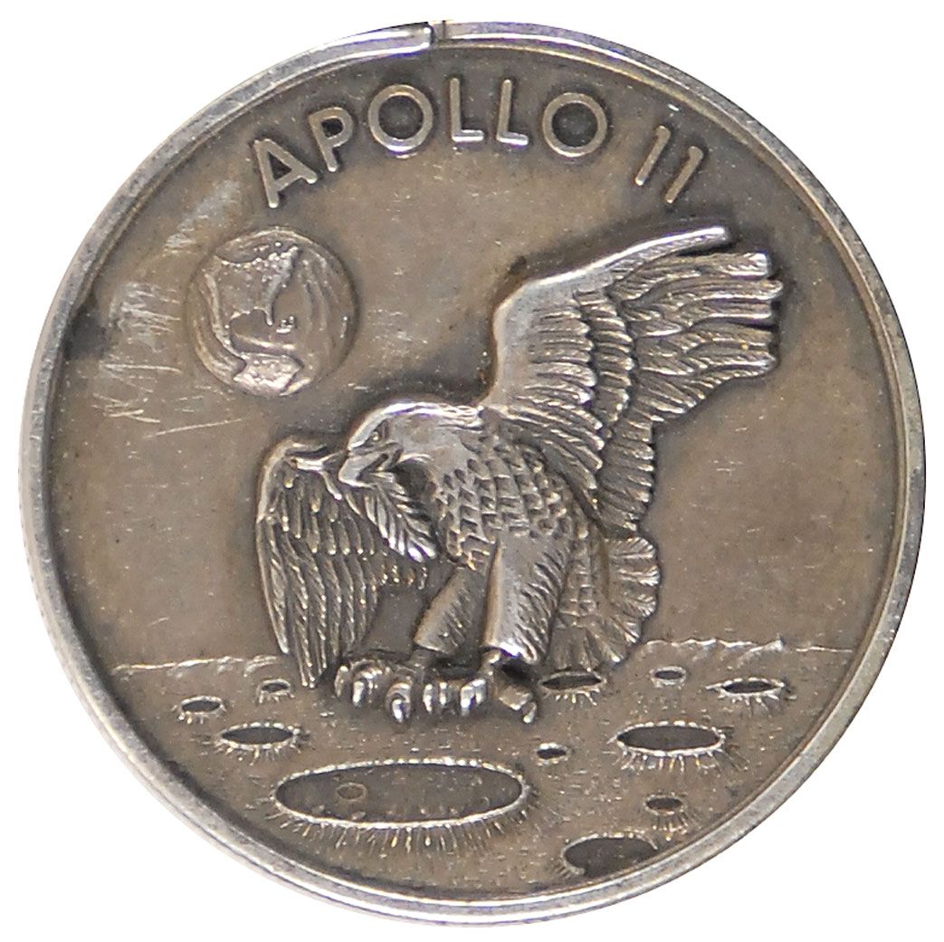 Unique and exceedingly desirable flown sterling silver Apollo 11 Robbins Medal originating directly from the family of Neil Armstrong, approximately 1.25? diameter, with a raised eagle carrying an olive branch in its beak. The reverse of the medal features the last names of astronauts Neil Armstrong, Buzz Aldrin, and Michael Collins, and is engraved with the launch date of July 16, 1969, moon landing date of July 20, 1969, and return date of July 24, 1969. The medal is serial numbered “236.” Condition is mint state, with expected age wear. Presented on a ring suspended from a silver chain to be worn as a necklace. This is the only Robbins medallion personally owned by Armstrong to ever come to market; after returning from the moon Armstrong gave this as a gift to his brother-in-law, Alfred ‘Bud’ Trude, and it was subsequently left to his son and Armstrong’s nephew, Mike Paul Trude.