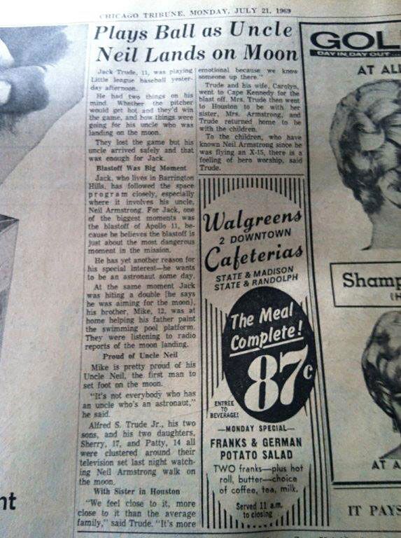 My parents even went to Florida for the Apollo 11 moon launch, on July 16, 1969. A few days later, Neil wasn’t the only one who made headlines. On July 21, 1969, the day after the Apollo 11 moon landing, the headline in the Chicago Tribune read: ‘Plays Ball as Uncle Neil Lands on Moon.’ The story mentions me and my brother Jack, who was playing baseball on July 20, 1969. The article reads, in part: ‘Jack Trude, 11, was playing Little League baseball yesterday afternoon…his brother Mike, 12, was at home helping his father paint the swimming pool platform. They were listening to radio reports of the moon landing…Mike is pretty proud of Uncle Neil, the first man to set foot on the moon. ‘It’s not everybody who has an uncle who’s an astronaut.’’