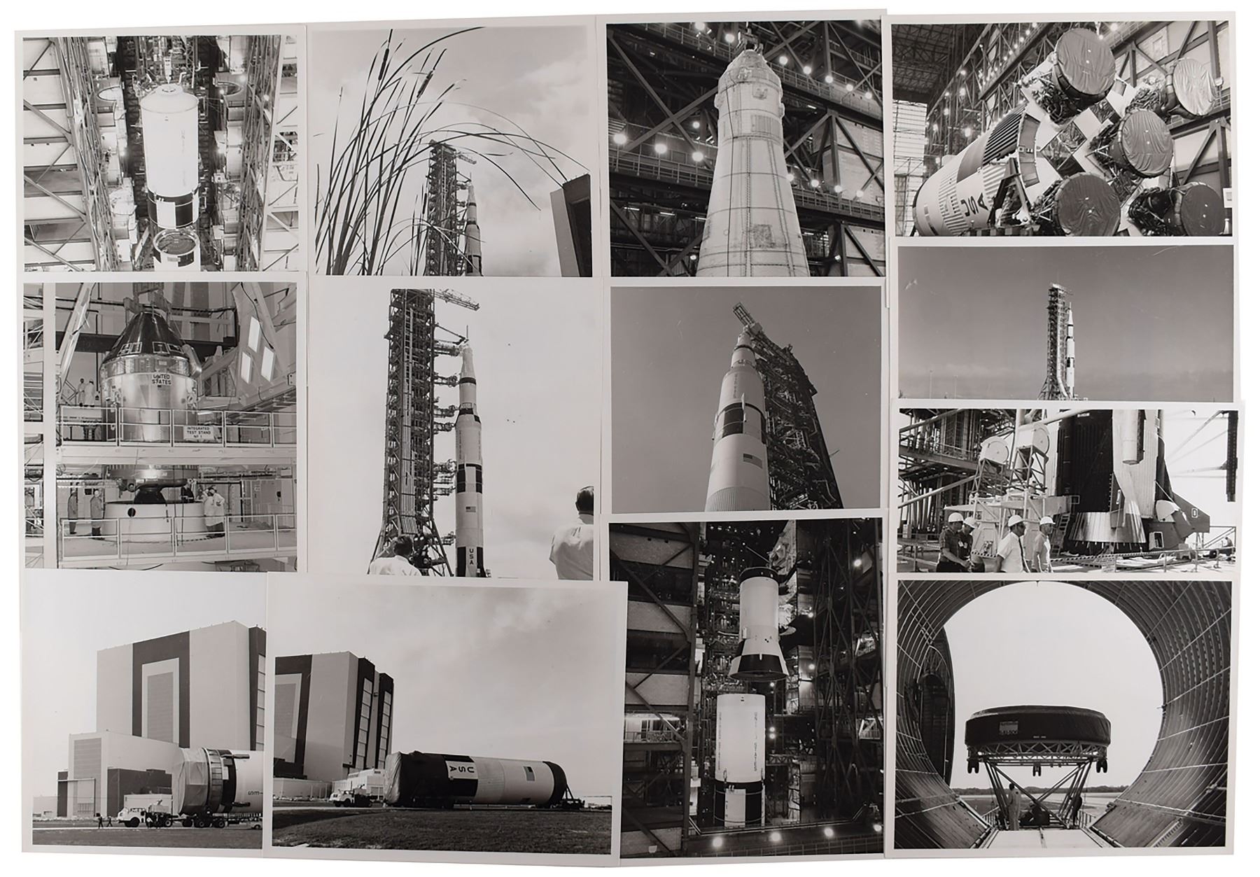 Group lot of 13 vintage original NASA photographs of the Apollo 11 spacecraft and its stages during assembly and prior to launch as viewed at the Vehicle Assembly Building and Manned Spacecraft Operations Building at the Kennedy Space Center, each glossy finished, 8 x 10 and 10 x 8, each bearing purple NASA caption text on reverse. Photos include: Apollo 11 crew members Neil Armstrong, Buzz Aldrin, and Michael Collins during a walkthrough for emergency egress routes; the 81-foot-tall second stage of the Saturn V being stacked atop its S-1C booster; the S-IVB third stage being hoisted on top of the S-II second stage; the command service module mated with its Spacecraft Launch Adapter; the arrival of the second stage, the instrument unit, and the S-IC booster; and several images of the Apollo 11 space vehicle and its mobile launcher during rollout. In overall fine condition, with trivial wear to edges.