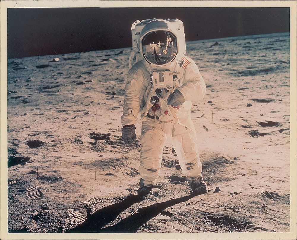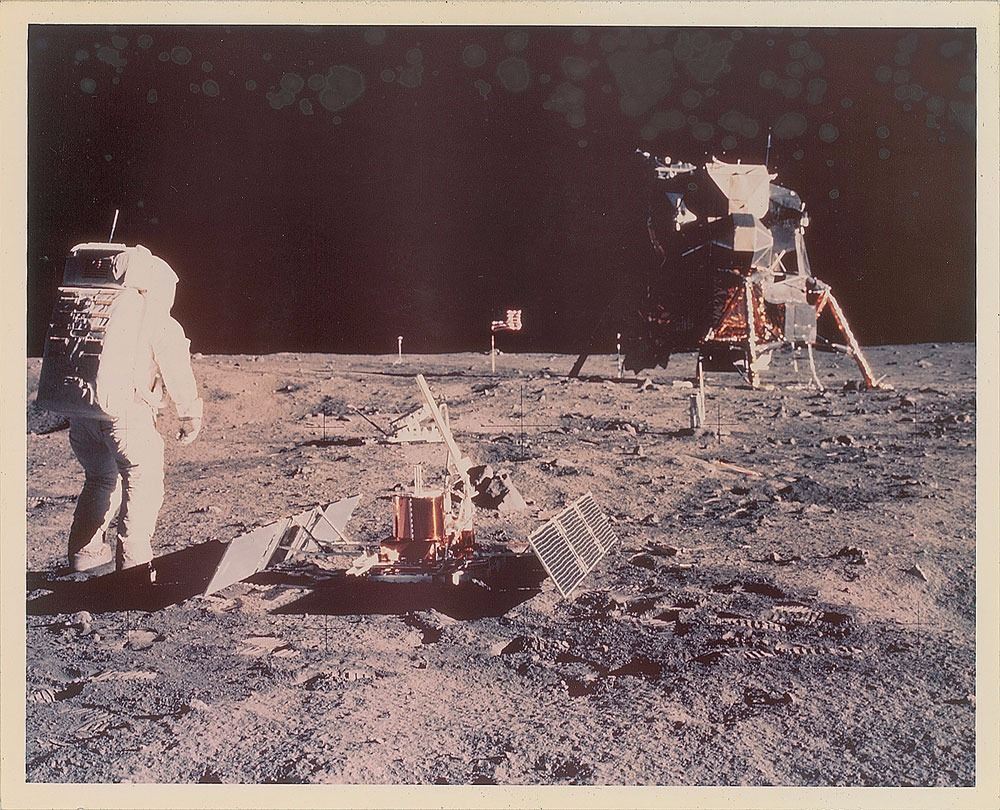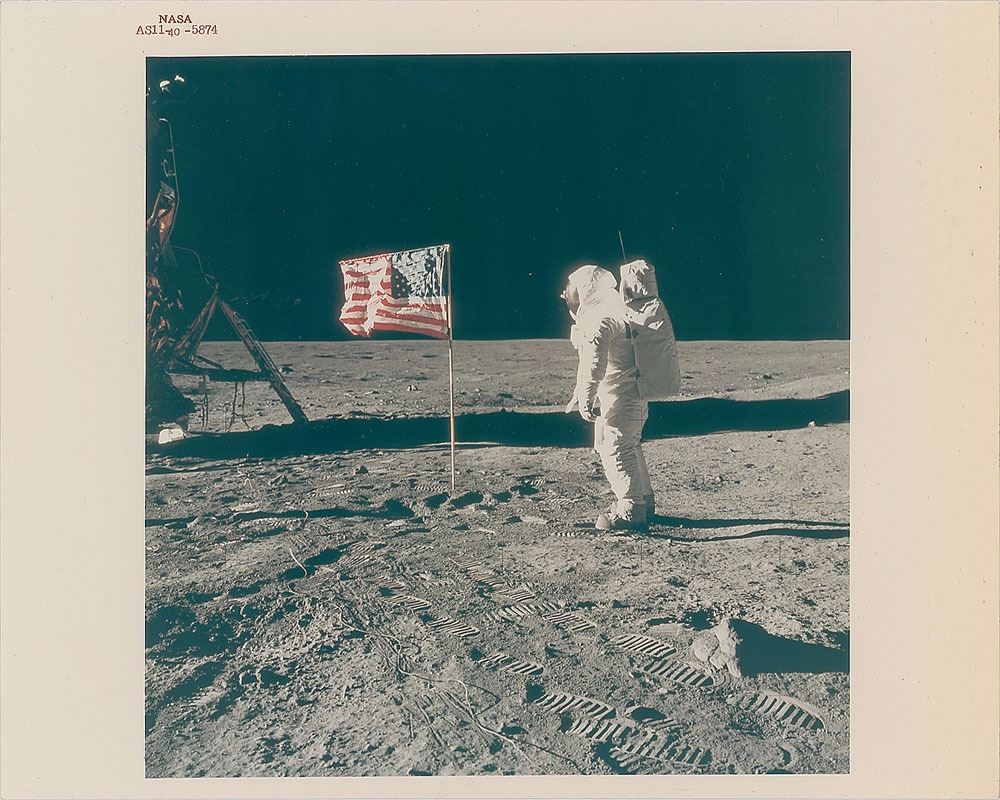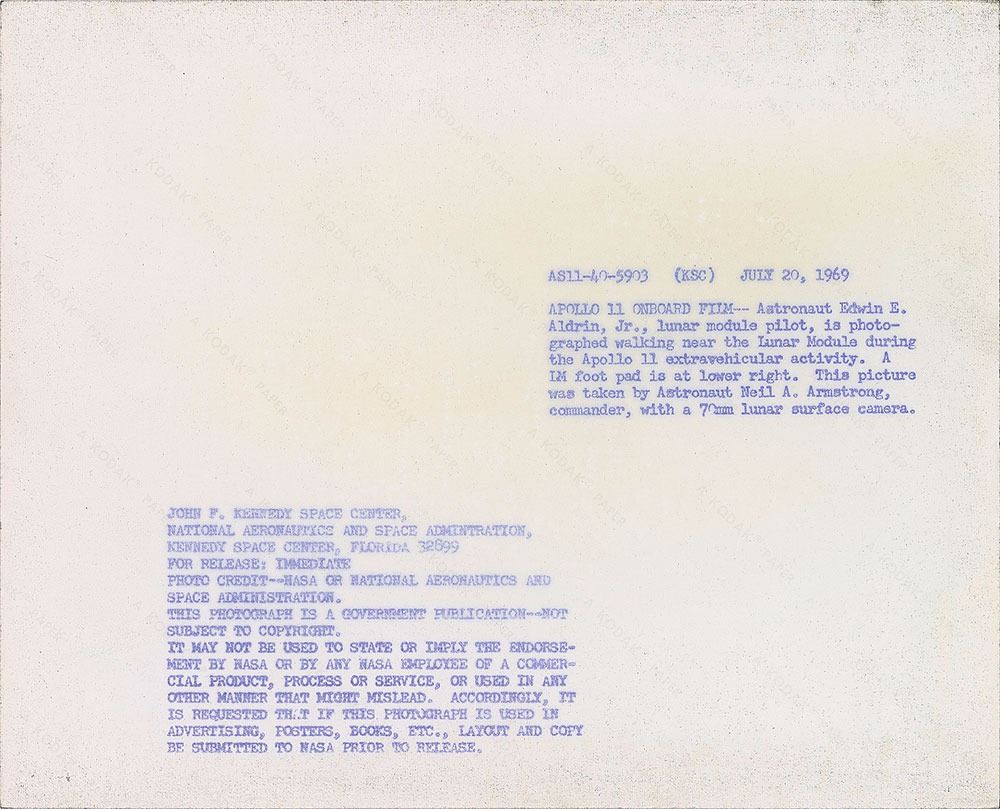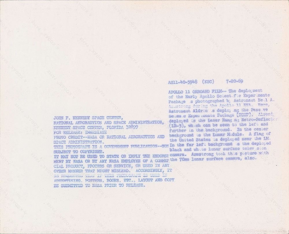 Fabulous collection of three vintage official color glossy 10 x 8 NASA photos of Apollo 11, including: a red-numbered photo of Buzz Aldrin next to the American flag on the lunar surface; the iconic image of Aldrin during the Apollo 11 EVA, with Armstrong and the LM reflected in his visor; and one featuring Aldrin and the just-deployed Early Apollo Scientific Experiments Package (EASEP) in the foreground, with the Lunar Module and American flag in the background. All bear “A Kodak Paper” watermarks on the reverse, and the latter two also have purple NASA caption text. In overall fine condition, with some spotting to the upper portion of the EASEP image. From the collection of Dan Schaiewitz, who worked as Extravehicular Crew Training Engineer at KSC.