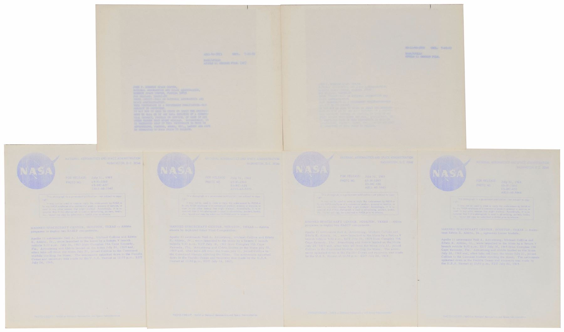 Set of six original vintage glossy NASA photos, ranging in size from 8 x 10 to 10.25 x 8, each depicting Lunar Module Pilot Buzz Aldrin during the Apollo 11 moon mission, with images including: an uncommon angle of Aldrin taking a large step as he descends from the top of the LM ladder; two images of Aldrin walking on the lunar surface carrying a pair of EASAP components; Aldrin as he sets up the Solar Wind Composition (SWC) experiment; and two images of Aldrin standing in front of the lunar module near the deployed SWC. Reverse of each photo bears official purple NASA caption text. In overall fine condition.