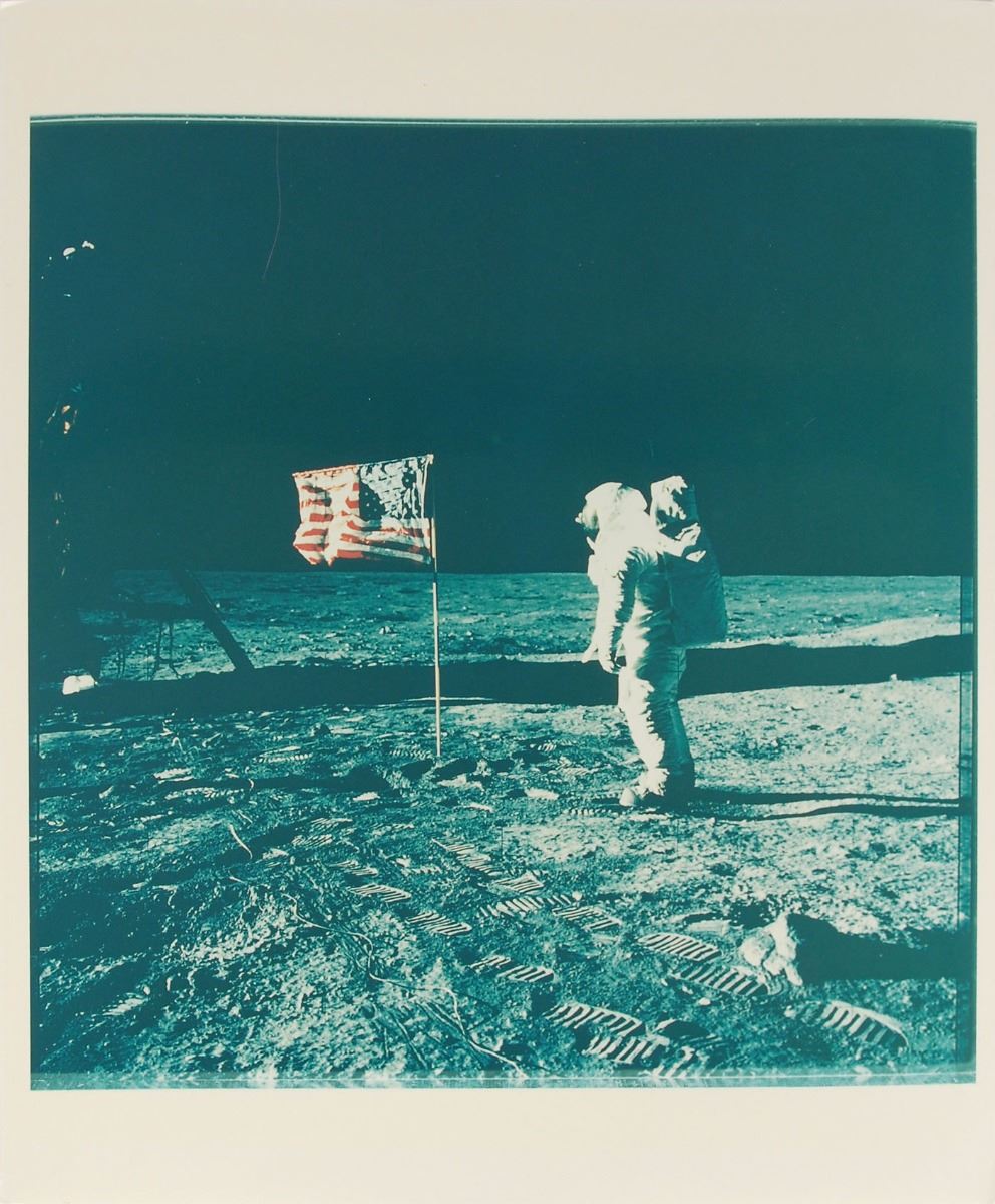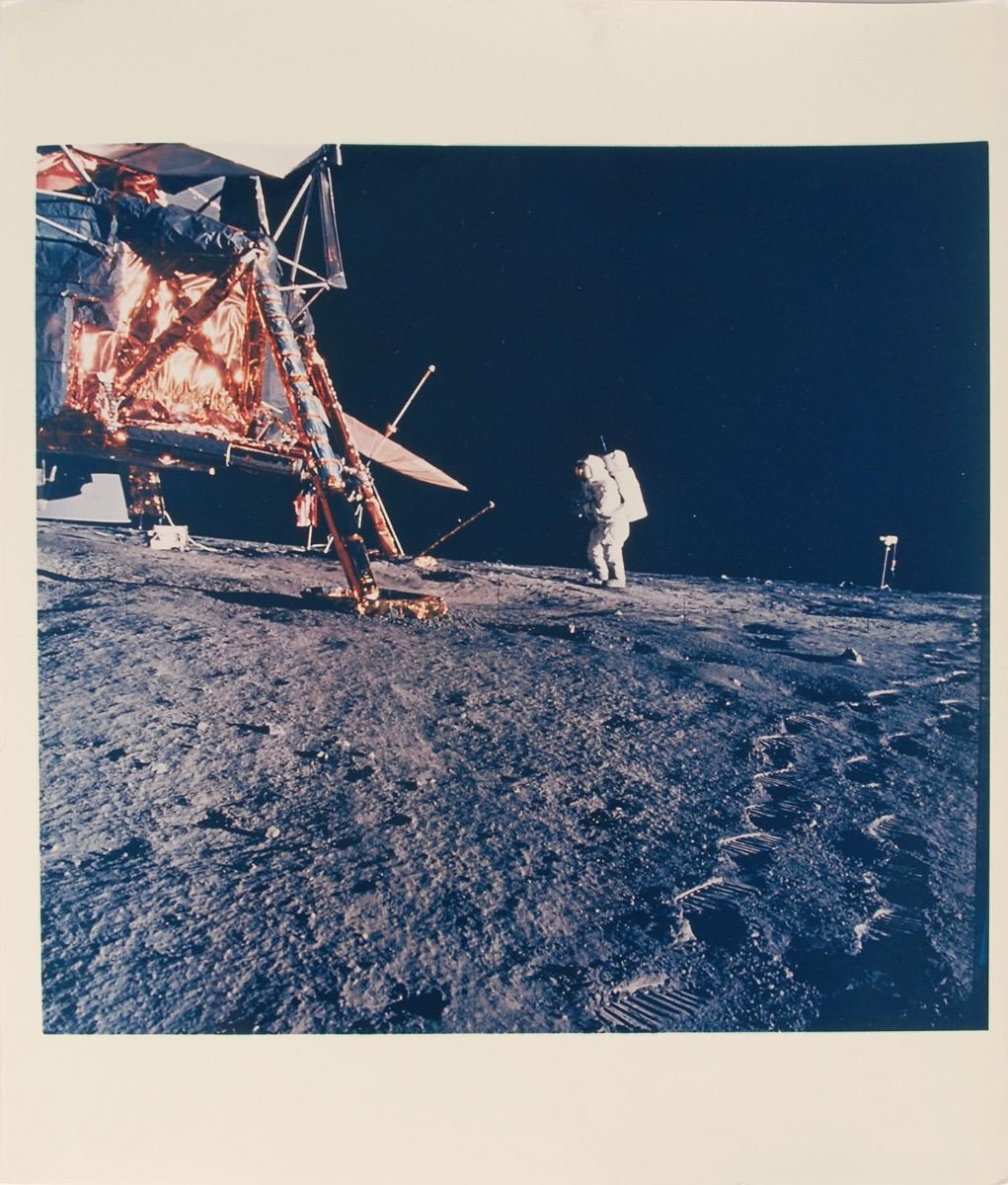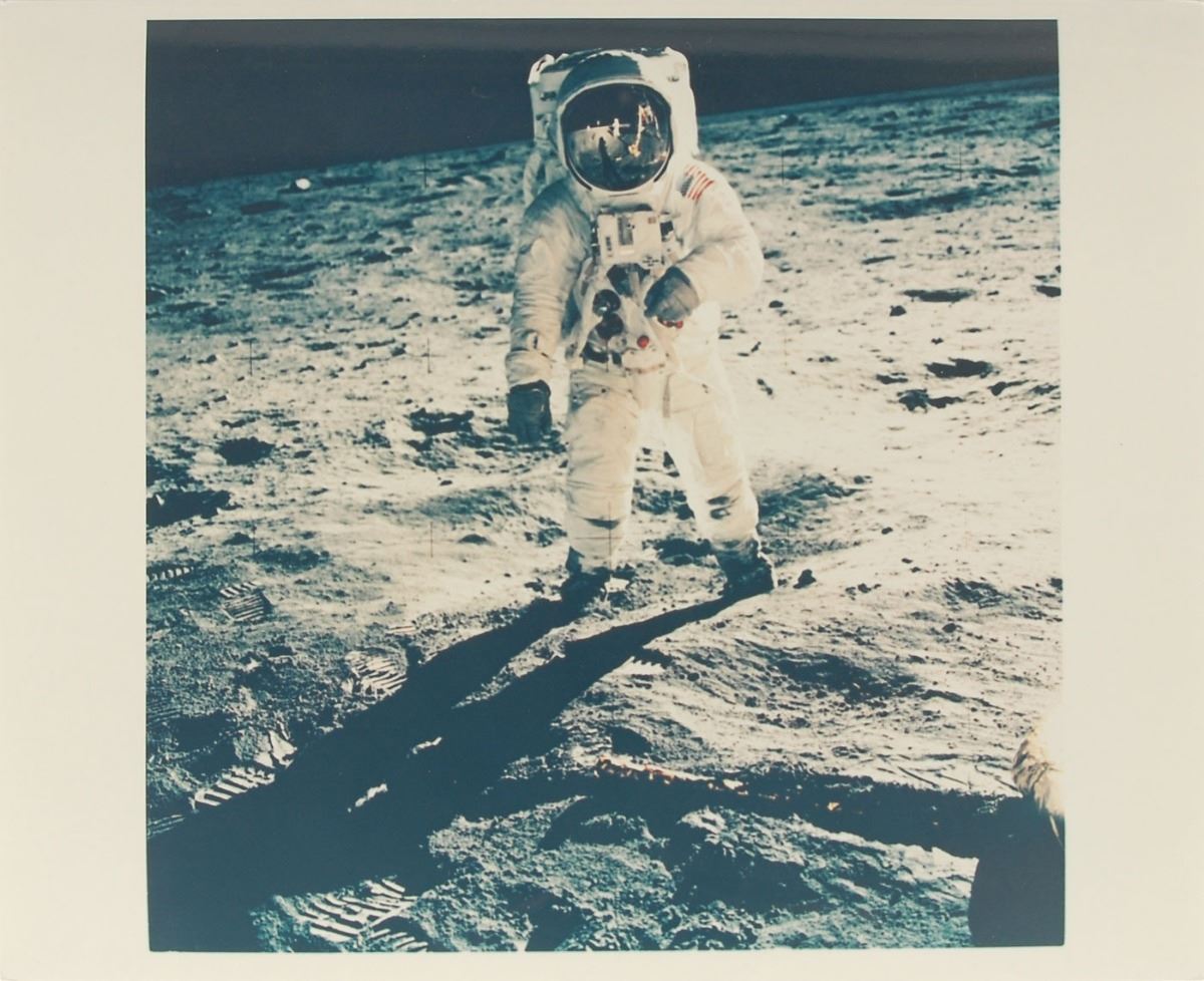 Beautiful collection of ten vintage official color glossy NASA photos, 8 x 10 and 10 x 8, each depicting various moments from the historic Apollo 11 lunar mission, including: the iconic full-length image of Buzz Aldrin on the lunar surface with the ‘Armstrong visor reflection’; two images of Aldrin standing near the American flag and the lunar module; three images of Aldrin conducting various experiments; Armstrong’s boot on the powdery lunar surface; Aldrin making his way over to the lunar module; a Kapton foil covered foot of the lunar module; and an open shot of the desolate lunar landscape. In overall fine condition. A beautiful and awe-inspiring collection of rare and iconic images from the Apollo program’s landmark mission.