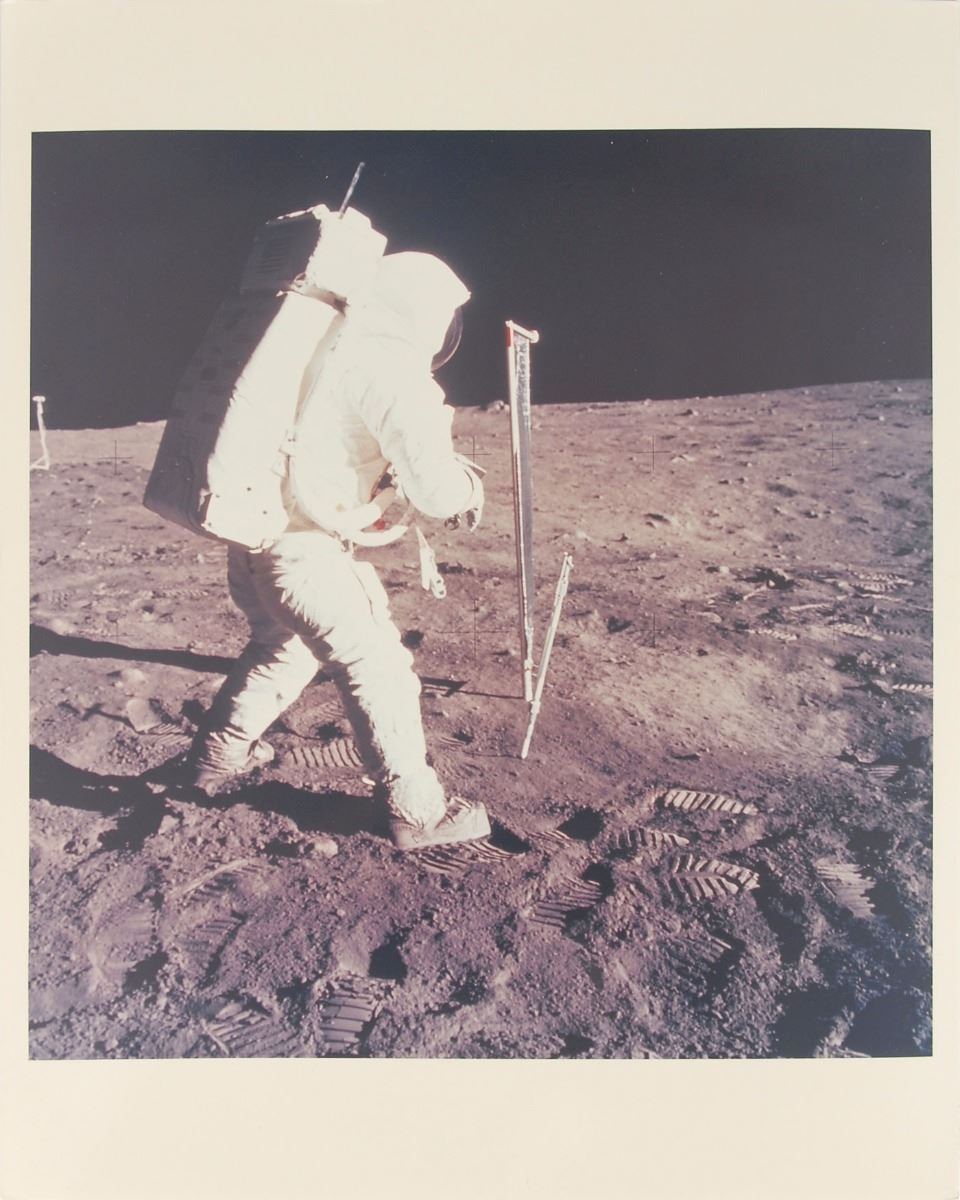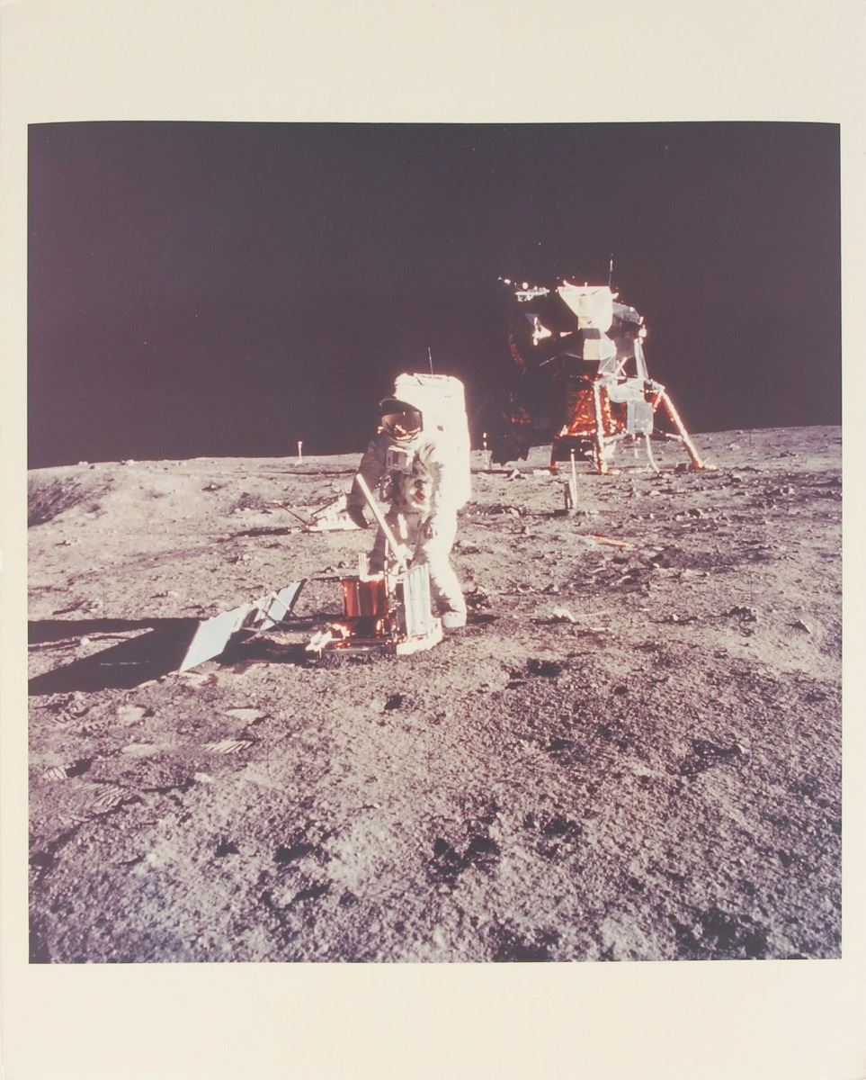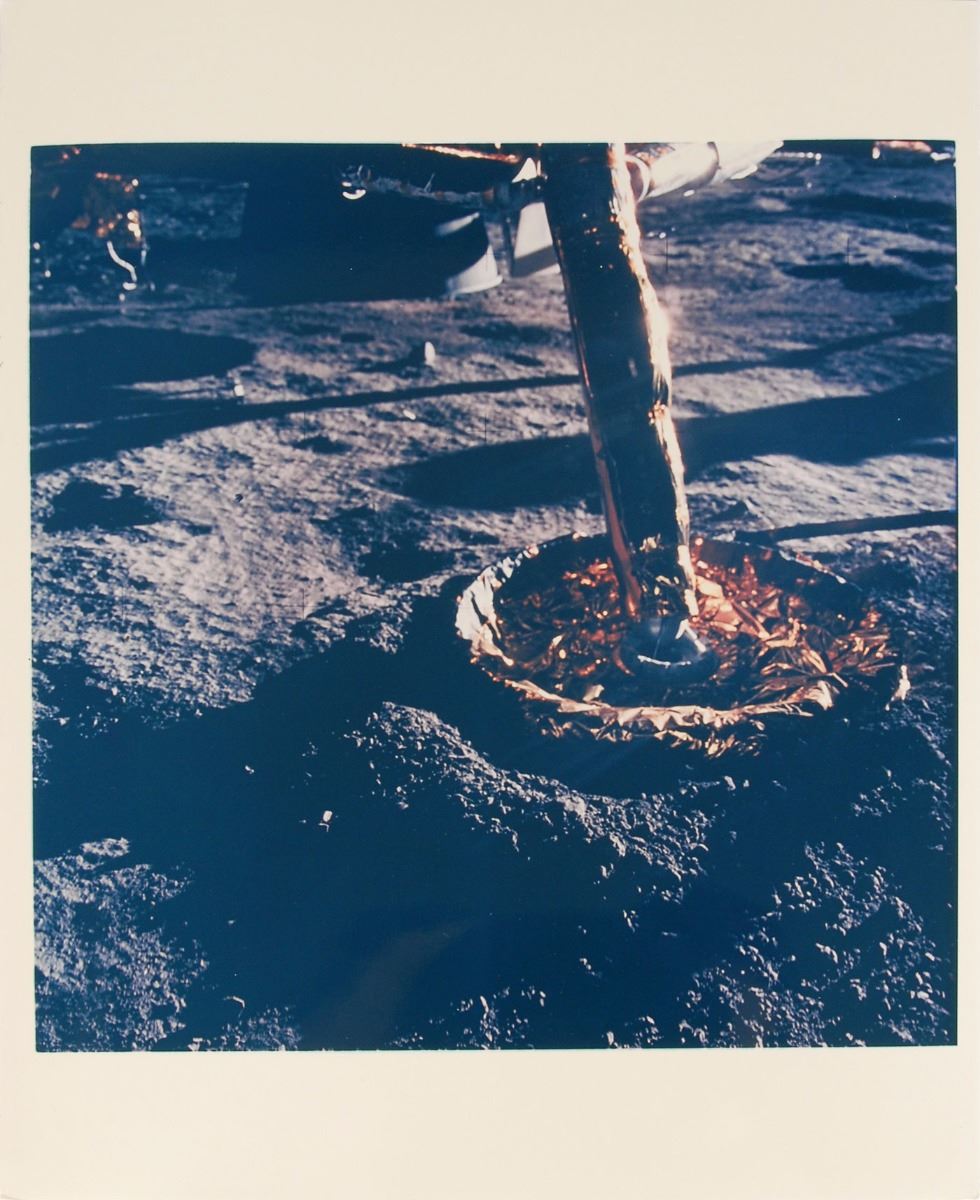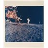 Beautiful collection of ten vintage official color glossy NASA photos, 8 x 10 and 10 x 8, each depicting various moments from the historic Apollo 11 lunar mission, including: the iconic full-length image of Buzz Aldrin on the lunar surface with the ‘Armstrong visor reflection’; two images of Aldrin standing near the American flag and the lunar module; three images of Aldrin conducting various experiments; Armstrong’s boot on the powdery lunar surface; Aldrin making his way over to the lunar module; a Kapton foil covered foot of the lunar module; and an open shot of the desolate lunar landscape. In overall fine condition. A beautiful and awe-inspiring collection of rare and iconic images from the Apollo program’s landmark mission.