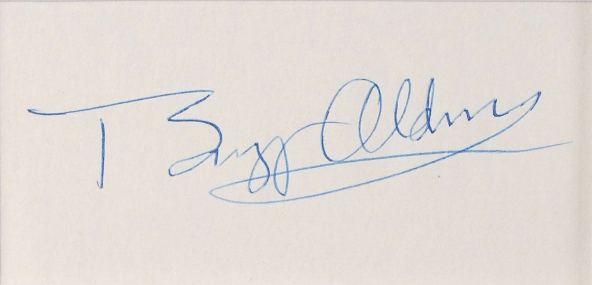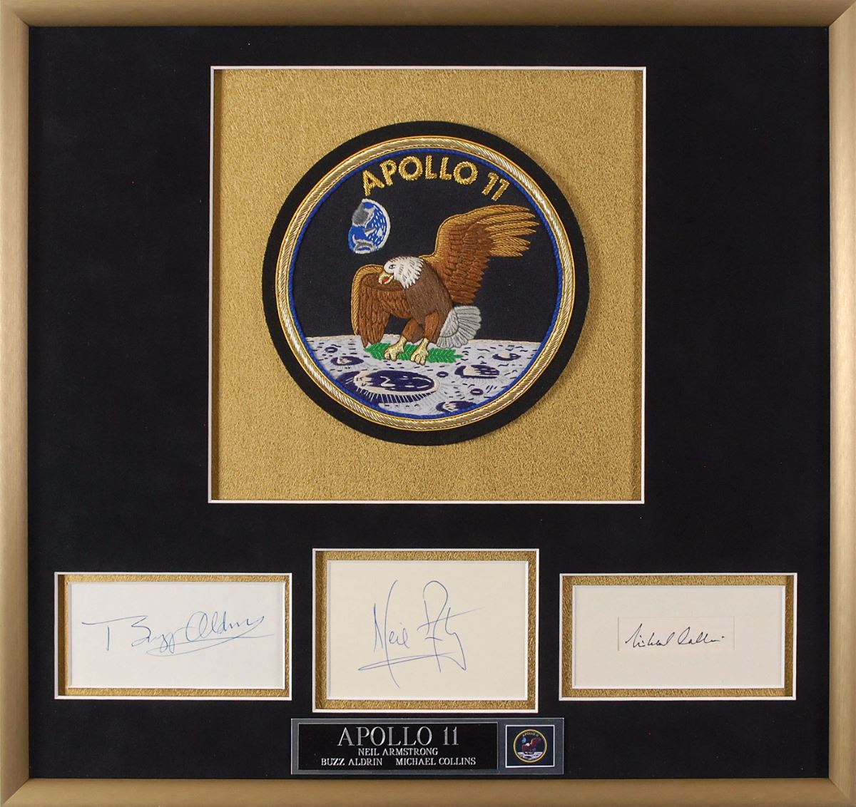 Impressive display of ink and ballpoint signatures of Neil Armstrong, Buzz Aldrin, and Michael Collins on individual off-white cards or sheets, with Collins’s signature matted. All three signatures are handsomely double-matted and framed together with a large embroidered Apollo 11 mission patch and a small engraved plaque to an overall size of 17 x 16. In fine condition.