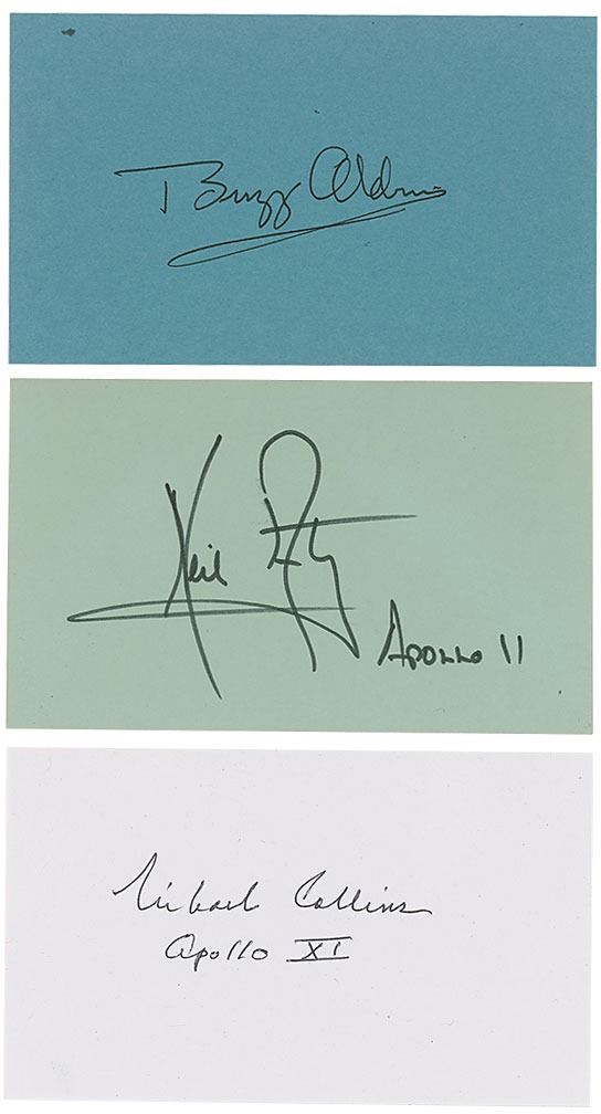 Desirable full set of crisp ink signatures, "Neil Armstrong, Apollo 11," "Buzz Aldrin," and "Michael Collins, Apollo XI," on individual 5 x 3 cards. In overall very fine condition. Accompanied by a certificate of authenticity from Astronaut Central for the Collins signature. A choice set of bold autographs from the crewmen that accomplished history's first lunar landing.