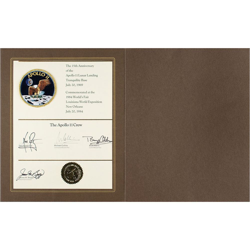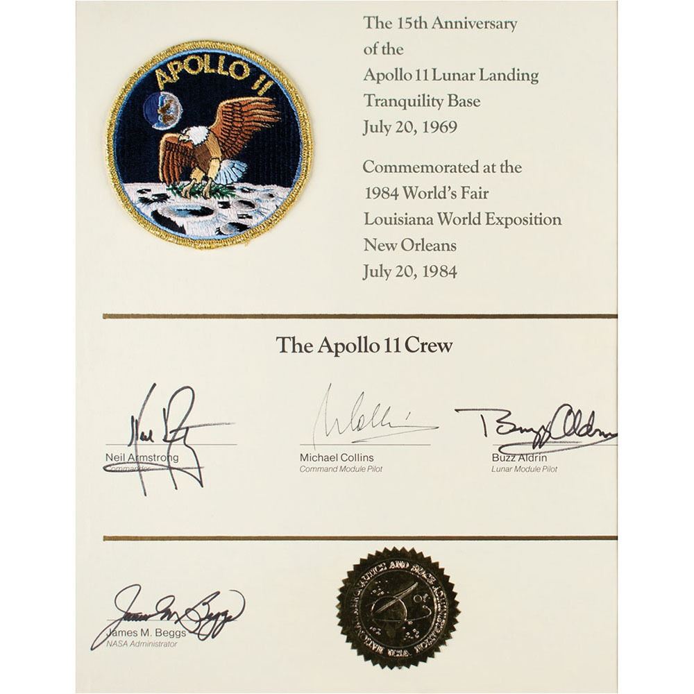 Uncommon certificate honoring the 15th anniversary of the Apollo 11 moon landing, 10.25 x 13.25, commemorated in New Orleans at the 1984 World's Fair, Louisiana World Exposition on July 20, 1984, signed in black felt tip by Neil Armstrong, Michael Collins, and Buzz Aldrin. Also signed by NASA administrator James M. Beggs, and bearing a souvenir Apollo 11 mission patch affixed to top left. Lower portion bears a gold foil NASA seal. Housed in its original 13.25 x 16.25 presentation folder. In very fine condition.
