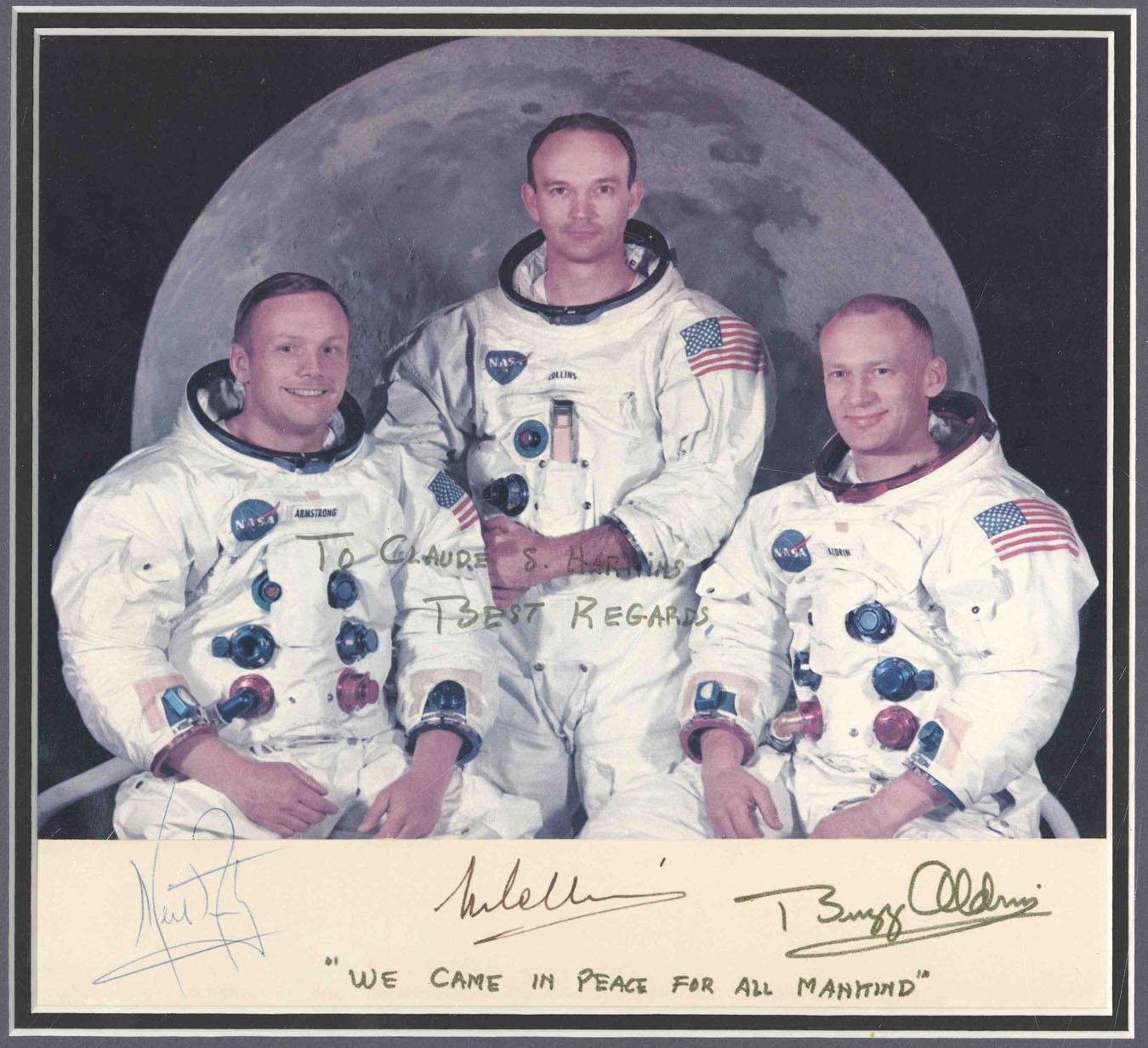 Apollo 11 photograph signed by Neil Armstrong, Buzz Aldrin and Michael Collins. Bold ink inscription reads, βTo Claude S. Harkins / Best Regards / Neil Armstrong / Michael Collins / Buzz Aldrin / 'We Came in Peace for All Mankind'.β Image measures 8β x 10β. Handsomely matted and framed, measuring 16.5'' x 16.5''. Very good condition.