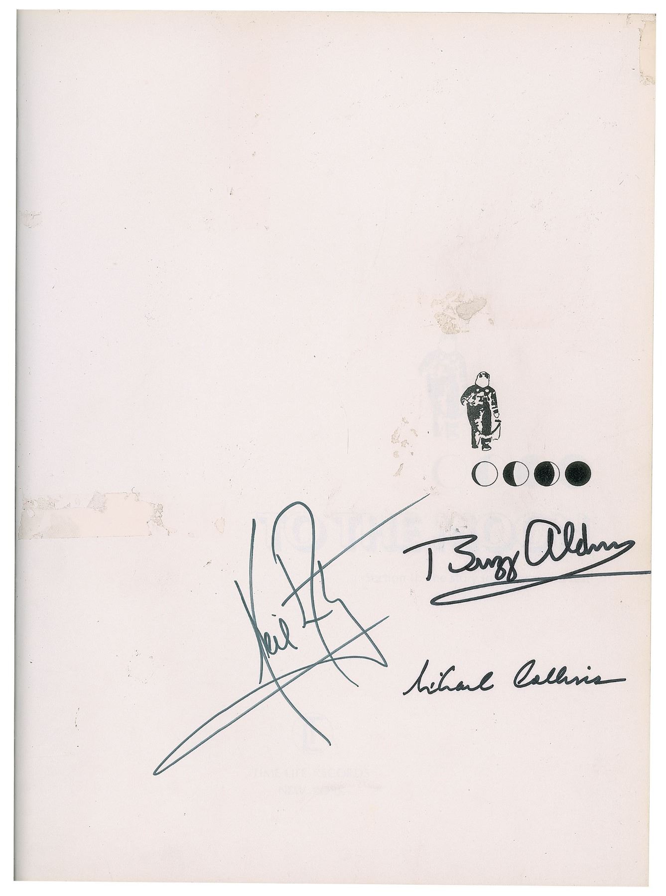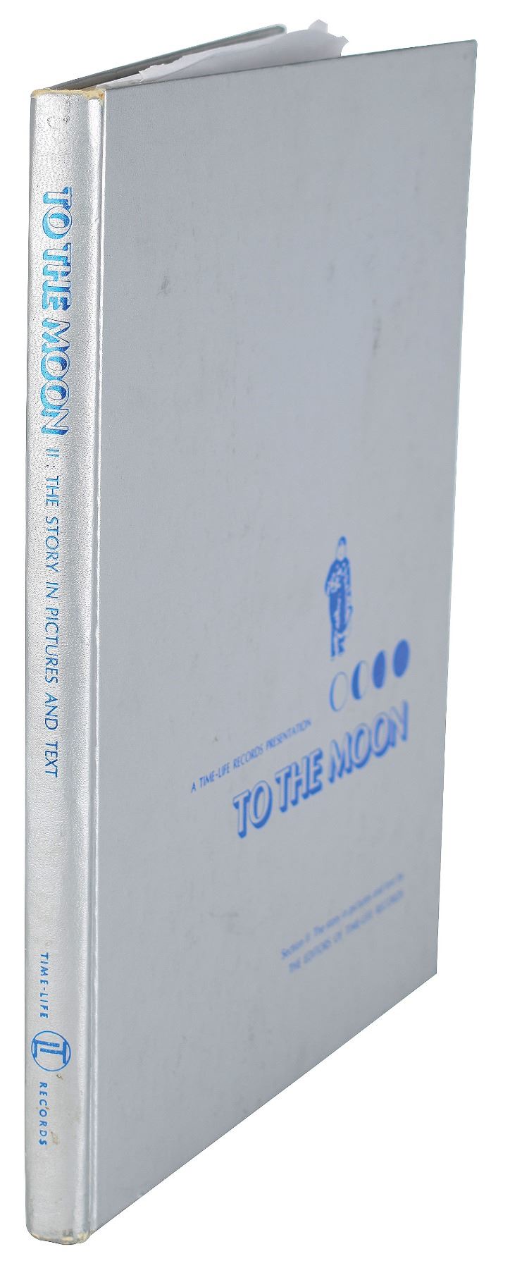 Scarce signed book: To the Moon, Section II: The Story in Pictures and Text. First edition. NY: Time-Life Records, 1969. Hardcover, 9.25 x 12.25, 192 pages. Signed on the half-title page in black felt tip by Neil Armstrong, Buzz Aldrin, and Michael Collins; the adjacent page bears an affixed plastic sleeve containing photos of Armstrong at an event, ostensibly the time he signed this book. In very good to fine condition, with tape stains and associated residue above the signatures. Accompanied by a certificate of authenticity from Novaspace for the Collins signature.